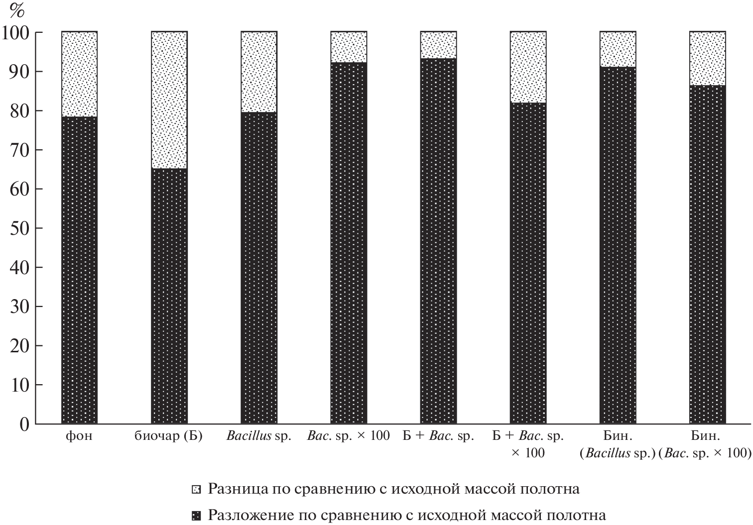Stable functioning of agricultural lands is impossible without maintaining soil fertility. However, there are often a lot of crop residues in the fields, which decompose for a long time and turn into available organic matter. To increase the rate of decomposition of crop residues of grain crops (wheat, barley and others), it is necessary to introduce biostimulants. Biostimulants are a variety of substances that stimulate the decomposition of organic substances and have a beneficial effect on the soil microbiota. The article examines the influence of Bacillus sp. on the processes of decomposition of crop residues of wheat both independently and together with biochar. The aim of the study was to evaluate the phytotoxicity of ordinary chernozem during the decomposition of crop residues of winter wheat under the influence of Bacillus sp. and biochar. To assess the ecological state of the soil, the following research methods were used: assessment of the rate of decomposition of cellulose (determination of cellulolytic activity), assessment of the ecological state of the soil (intensity of CO2 emissions, changes in the intensity of initial growth and development of winter barley (Hordeum vulgare L.)). Introduction of Bacillus sp. × 100 and the joint use of biochar and Bacillus sp. it stimulated the decomposition of cellulose up to 14–15% of the background content. Inoculation of Bacillus sp. on the biochar, it was effective already at the recommended dose both for the decomposition of the cellulose web and for restoring the ecological state of the soil, demonstrating a synergistic effect. The results obtained should be used in carrying out measures to increase soil fertility of agricultural lands and environmental monitoring of soil conditions.