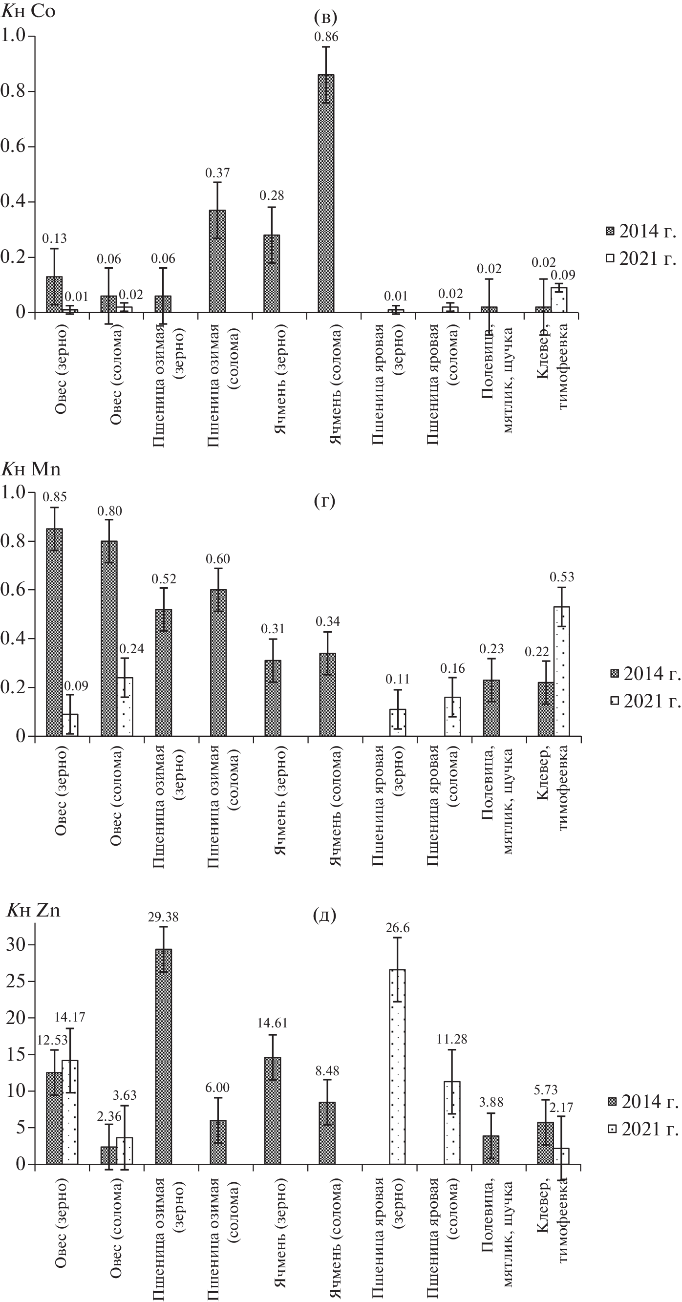 The paper presents the results of a survey of sod-podzolic soils for agricultural purposes and plants of reference sites of the Ivanovo region for the content of boron, copper, cobalt, manganese and zinc in them, conducted in 2014 and 2021. Correlation analysis determined the influence of individual physical and chemical properties of soils on the content and distribution of available forms of trace elements in the soil and the relationship between the trace elements themselves. Changes in the availability of trace elements of the soils of the plots have been established. According to the amount of content of available forms of trace elements in soils, the need for the use of micronutrients is determined. The sequences of crops were determined by the content of trace elements in grain and straw of cereals, the green mass of forage grasses, as well as the distribution of trace elements between parts of the grown crop. Grain, straw and green mass were evaluated for compliance with veterinary standards for the content of copper, zinc and cobalt in feed. The coefficients of accumulation of trace elements by plant products of crops are calculated and their comparative analysis is carried out. By the magnitude and sign of the correlation coefficients between the concentrations of trace elements in plants, the manifestation of antagonism and synergy between trace elements was determined. The Pearson and Spearman correlation coefficients between the content of mobile forms of trace elements in the soil and their content in plant products, as well as between the content of trace elements in grain and straw of cereals revealed their strength and the ambiguous nature of the relationships..