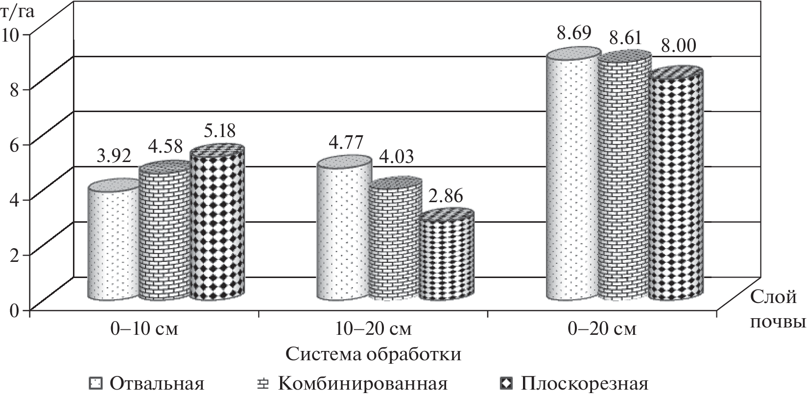In a long-term stationary experiment on the basis of a 4-pole fruit-bearing crop rotation, the influence of processing methods with different levels of mechanical impact on the soil was studied: dump (plowing to a depth of 20–22 cm), combined (alternating plowing, plane-cutting processing (to a depth of 10–12 cm), without processing) and plane-cutting processing on the content of organic matter and the structural and aggregate composition of meadow-chernozem soil. It was found that a decrease in the intensity and depth of tillage with a combined and flat-cut system increased the humus content by 0.30 and 0.48% in a layer of 0–20 cm in comparison with dump treatment. The tillage system had a significant impact on the layer-by-layer distribution of labile organic matter in the form of mortmass. The largest stocks of mortmass in the arable layer were noted in the variant of the dump tillage system – 8.69 t/ha. On resource-saving backgrounds, a tendency to decrease the stocks of mortmass in the soil by 0.08–0.69 t/ha was revealed. The contribution of agronomically valuable structural units of 0.25–10 mm in size was 43.1–65.4 in layers, and the yield of large lumps and dust was 34.6–56.9% of the soil mass. The best structural condition of the soil is marked when using a dump treatment system. The presence of a close correlation between the stocks of mortmass in the soil layer of 0–20 cm and the content of structural-aggregate fractions with a size of 10–5 mm (r = 0.72 ± 0.11) and 5–3 mm (r = 0.68 ± 0.10) was established.