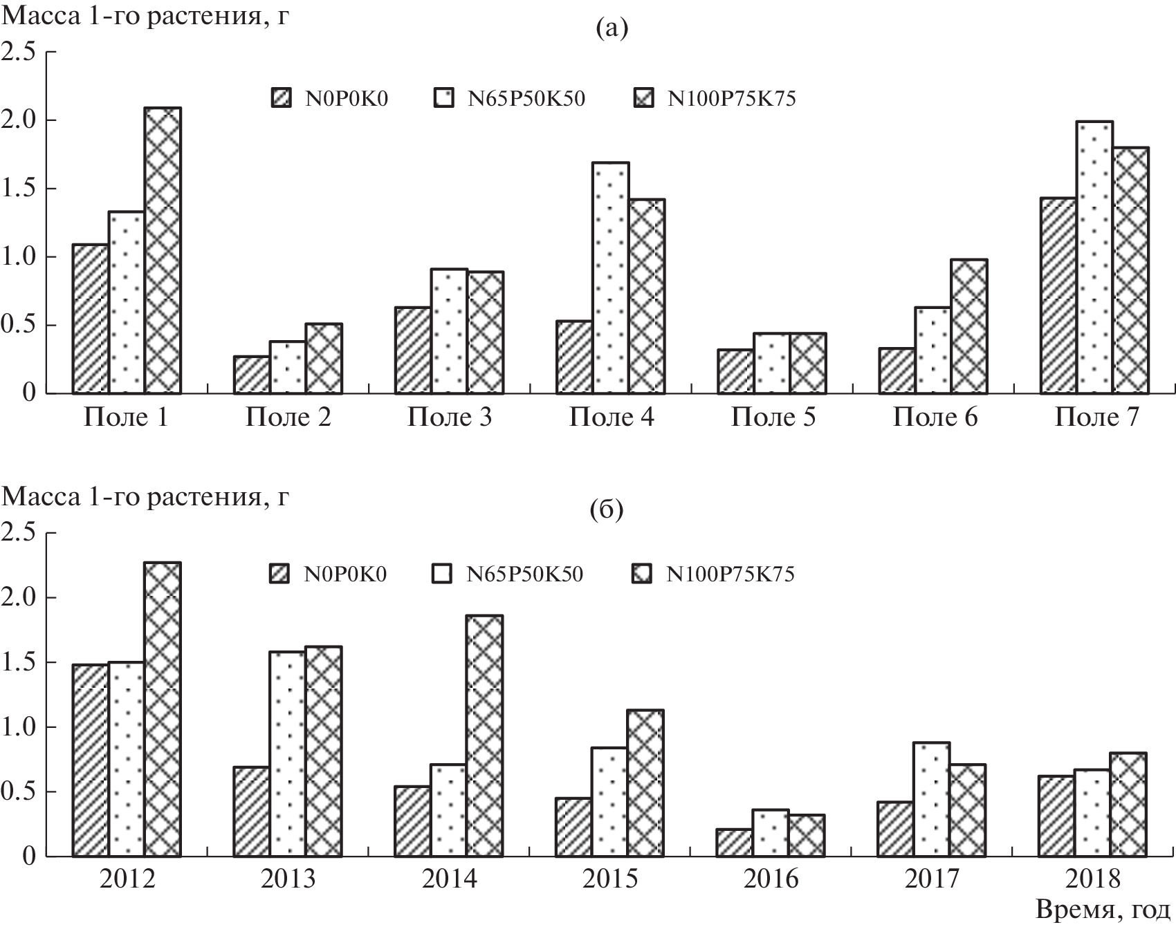 In a long-term study in a long-term stationary experiment, it was revealed that the effect of mineral fertilizers extended to the quantitative composition and structure of the contamination of fields of grain-grass crop rotation, but not to the species composition of weed vegetation. Under the influence of mineral fertilizers, the height and weight of weeds increased, but their number decreased during the period of co-growth with cultivated plants during the growing season (by 12.0–22.6%). In the absence of a pronounced competitiveness of cultivated plants in the non-maneuverable version of the experiment, the weeds from the spring period to the harvest increased by 47%. The contamination of fields with perennial dicotyledonous weed species and their relative abundance in fertilized variants decreased by 2.4–3.6 times, and with small-year dicotyledonous species increased by 1.3–1.4 times. White marjoram and pickles turned out to be responsive to the application of mineral fertilizers, while field thorice and wild radish mainly grew in an untreated version, where the acidity of the soil had higher indicators.