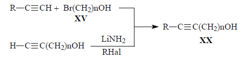 Для получения высших ацетиленовых спиртов из алкилацетиленов в качестве алкилирующего агента используют оксиалкилгалогениды с замещенной спиртовой группой. Для проведения таких реакций ГМФТ является наиболее подходящим растворителем, поскольку выход дизамещеных ацетиленов достигают 60–80% [11]. Замена хлора на бром в тетрагидропираниловых (ТГП) эфирах приводит к повышению выхода на 10–15%. Незамещенные ω-бромалканолы-1 (V) или терминальные ацетиленовые спирты (VI) можно также с успехом применять для синтеза оксиалкилацетиленов [12]: