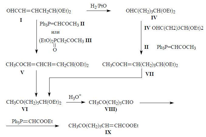 Цис-7-додеценилацетат является компонентом феромона совки гамма (Autographa gamma). Синтез его синтетического аналога основывается на взаимодействии карбэтоксиметилентрифинилфосфарана (V) с монодиэтилацеталь-пимелиновым альдегидом (I) и проходит с образованием диенового эфироацеталя (VI) с хорошим выходом. Гидрирование (VI) над окисью платины дает продукт – эфироацеталь (IV). Кислый гидролиз этого ацеталя в мягких условиях приводит с высоким выходом к этиловому эфиру 7-оксогептановой кислоты. Затем проводят конденсацию альдегида (VII) с пентилидентрифенил фосфораном (VIII) в условиях “цис-олифинирования” (VIII). Последний продукт восстанавливают алюмогидридом лития в соответствующий 7-цис-додецен-1-ол (XVI), который окисляют с помощью хлорхроматомпиридина в цис-7-додеценаль и ацелируют до продукта (XIV):
