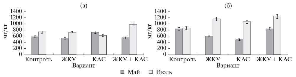 В мае на участке с горохом при внесении удобрения КАС содержание активного углерода было больше (на 26% больше контроля), чем в вариантах с ЖКУ и ЖКУ + КАС. Применение ЖКУ и КАС на участке с нутом отрицательно повлияло на содержание активного углерода (на 27–42% меньше контроля). Достоверных отличий совместного действия ЖКУ + КАС на данный показатель не было обнаружено.