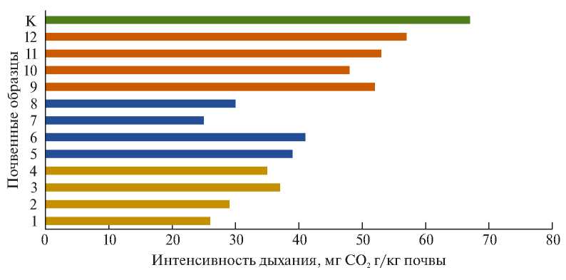 Рис. 1. Интенсивность дыхания образцов, отобранных из разных горизонтов почвы, загрязненной пестицидами