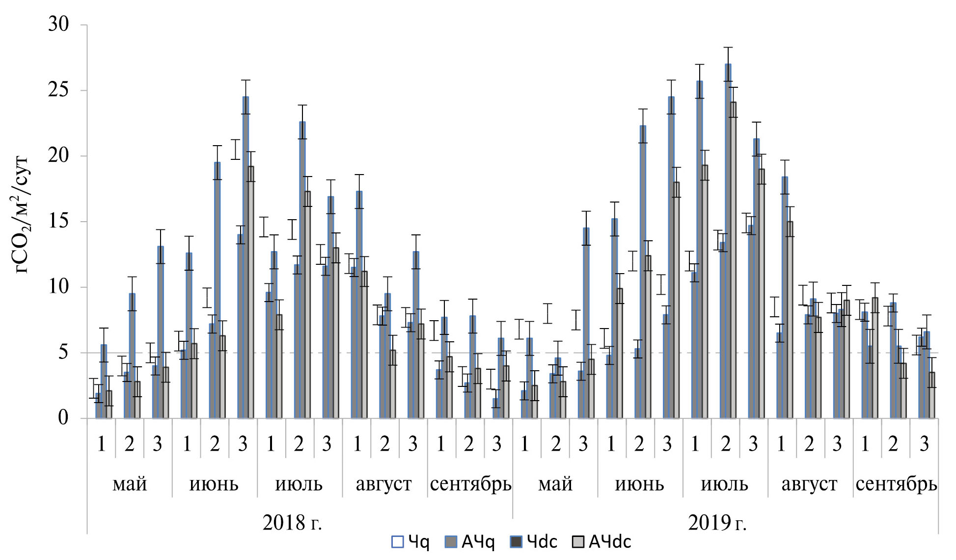 Рис. 1. Динамика эмиссии СО2 из черноземов за вегетационный сезон 2018–2019 г. Чq – чернозем квазиглеевый, Чdc –чернозем дисперсно-карбонатный, АЧq – агрочернозем квазиглеевый, АЧdc – агрочернозем дисперсно-карбонатный, то же на рис. 2, 3; 1–1-я декада, 2–2-я декада, 3–3-я декада.
