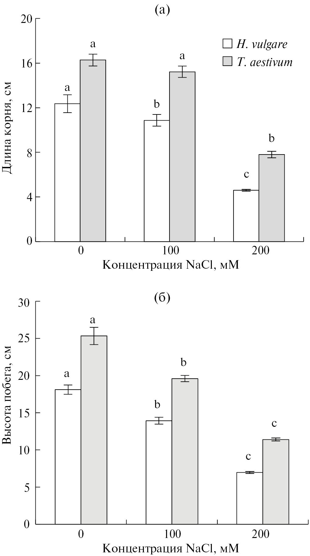 Оценка устойчивости злаков к избытку хлорида натрия, проведенная на основе морфометрических показателей роста проростков, позволила обнаружить определенные межвидовые различия даже при умеренной концентрации (100 мМ) соли. Например, у ячменя в этих условиях уменьшалась длина корня, тогда как у пшеницы этого не наблюдали. При использовании высокой концентрации NaCl (200 мМ) более сильный ингибирующий эффект соли в отношении показателей роста корня и побега был выявлен и у ячменя, и у пшеницы.