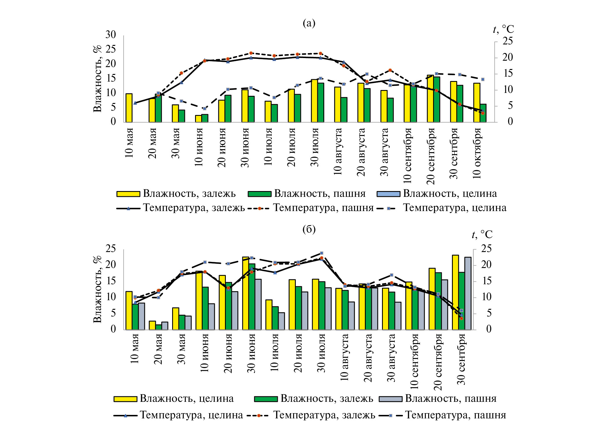 Рис. 2. Температура и влажность почвы: (а) – 2018 г., (б) – 2019 г.