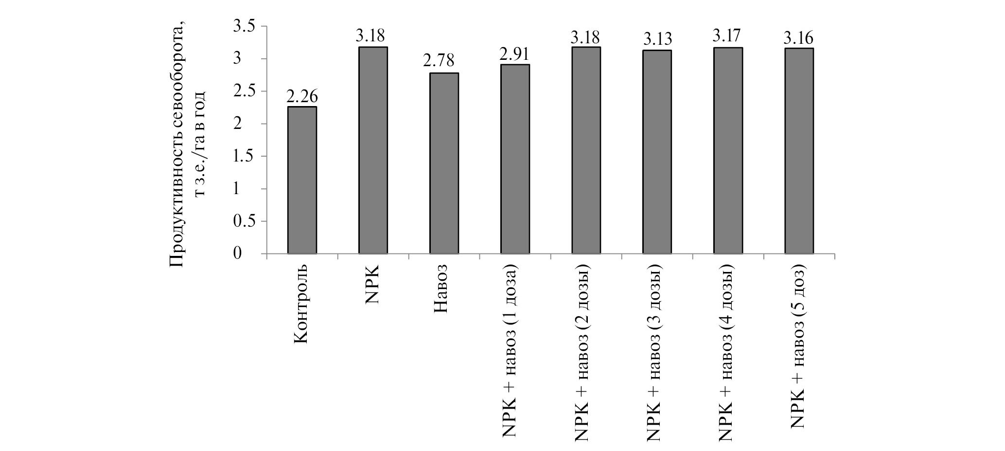 В варианте применения только навоза в двойной дозе, соответствующей внесению 6 т навоза/га ежегодно, средняя продуктивность севооборота составила 2.78 т з. е./га, или на 23% больше контроля. При внесении минеральной системы, а также органо-минеральной системы 2, т. е. в вариантах с таким же количеством питательных элементов, как и в органическом варианте, ежегодная продуктивность севооборота находилась на уровне 3.18 т з. е./га, что на 40.7% превышало контроль без внесения удобрений. Дальнейший рост доз удобрений в органо-минеральных вариантах не сопровождался повышением урожайности культур севооборота.