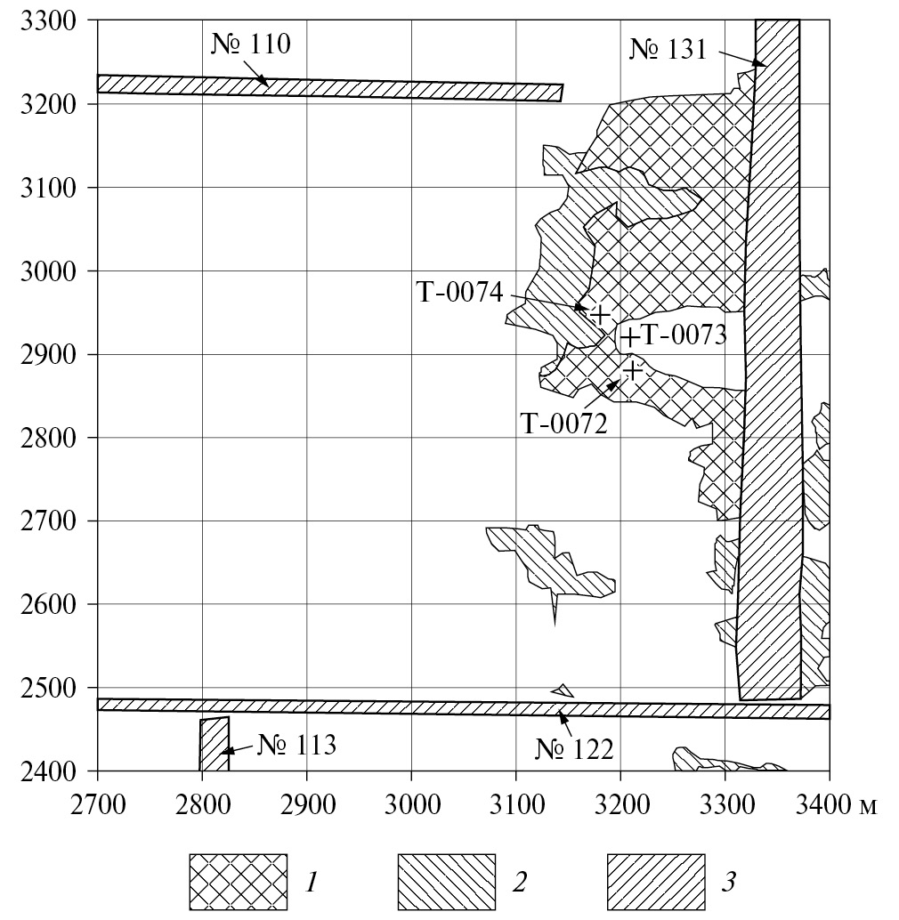 Рис. 1. Схема расположения объектов исследования [25], местоположение разрезов Т-0074 (Р-1), Т-0073 (Р-2) и Т-0072 (Р-3): 1 – ареалы, затопленные весной 2006 г., 2 – ареалы, переувлажненные весной 2006 г., 3 – лесополосы (указан номер).