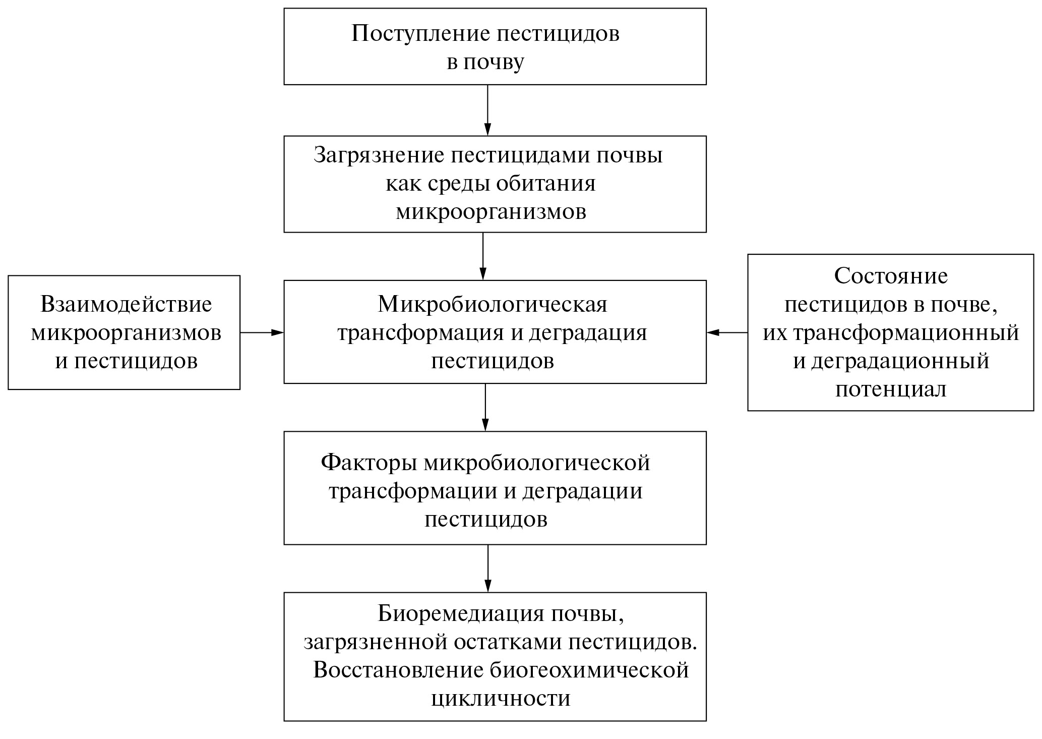 При рассмотрении проблемы микробной трансформации пестицидов прежде всего необходимо создание концептуальной модели данного биогеохимического процесса. Это может позволить реконструировать загрязнение почв и поверхностных вод ДДТ и ГХЦГ по данным их мониторинга в различных природно-экономических регионах. В целом микробиологическую трансформацию и деградацию пестицидов в почве, поступающих в эту среду различными путями, можно представить в виде концептуальной модели (рис. 1).
