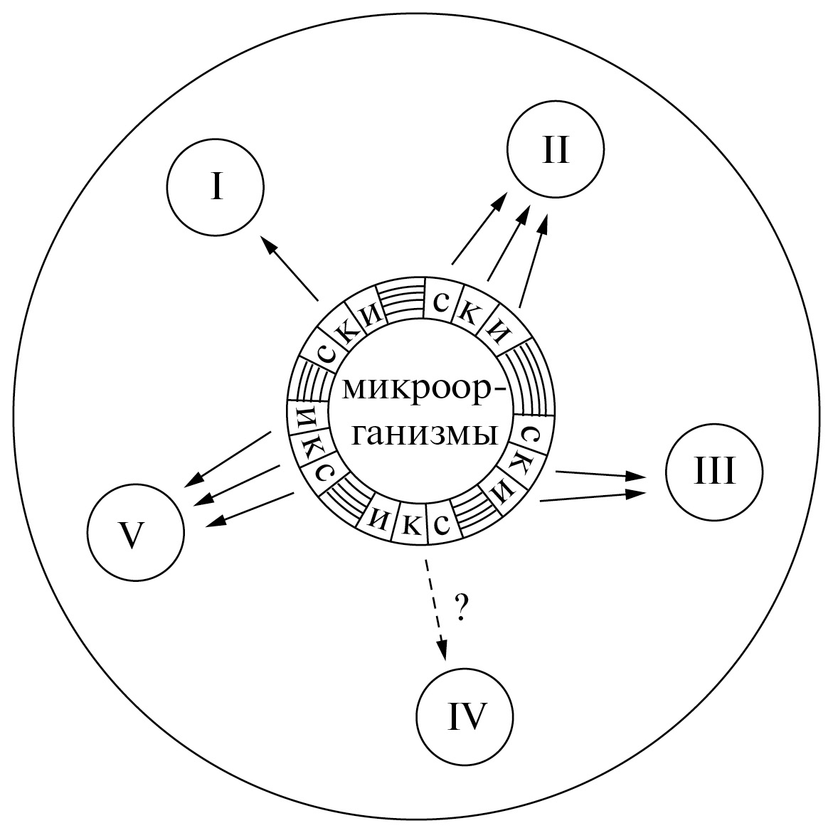Рис. 2. Схема взаимодействия микроорганизмов и пестицидов в почве: С – свободные клетки в почвенном растворе; К – колонии, пленки, группы микроорганизмов на поверхности почвенных частиц; И – микроорганизмы, иммобилизованные в органоминеральных гелях и структурных элементах почвы; I – пестициды (частицы, капли, пленки); II – пестициды в растворе; III – физически связанные пестициды; IV – пестициды в межпакетном пространстве глинных минералов; IV – химически связанные пестициды.