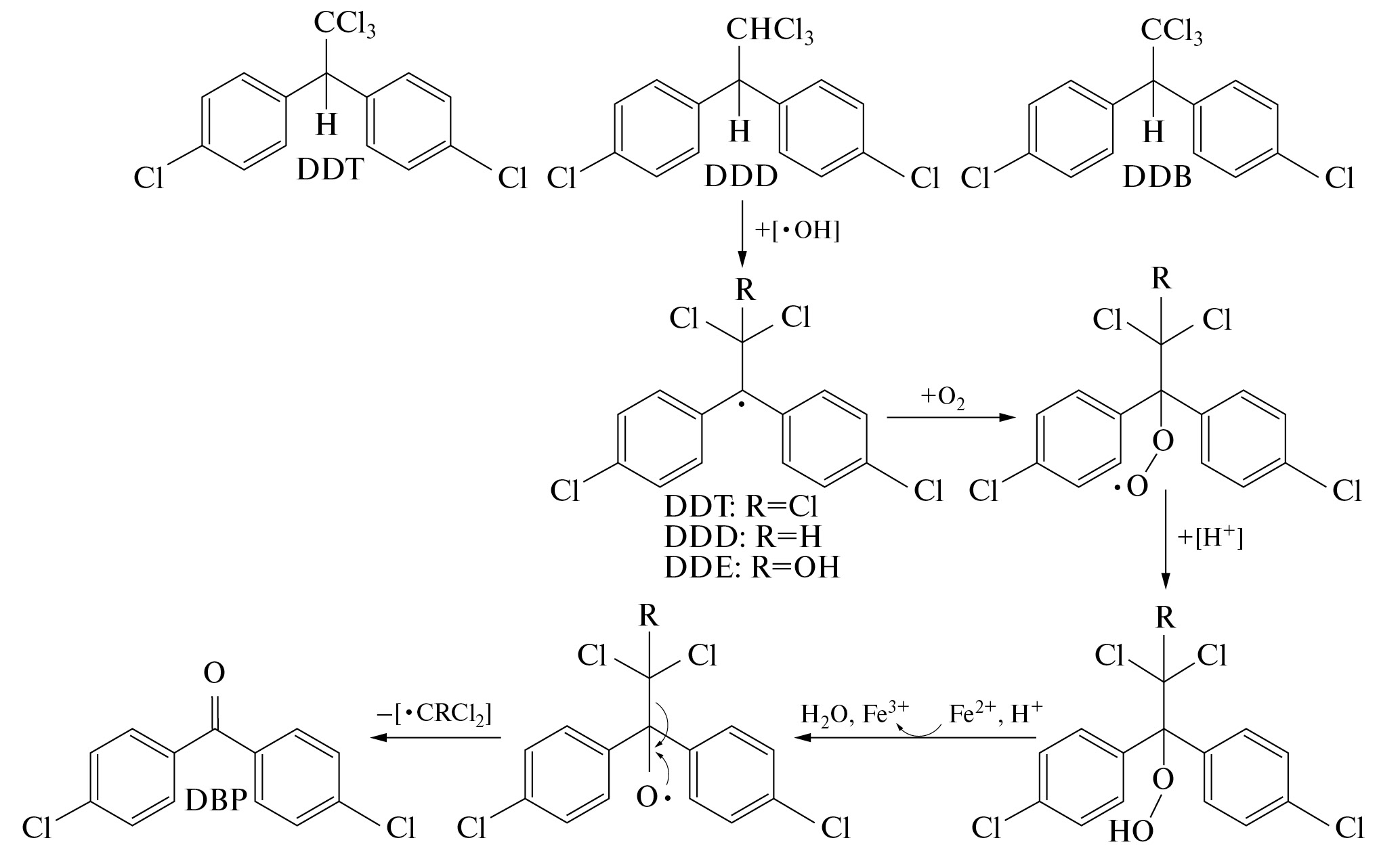 Рис. 3. Трансформация DDT (R = Cl), DDD (R = H) или DDE (R = OH) в DBP в реакции Фентона [10].