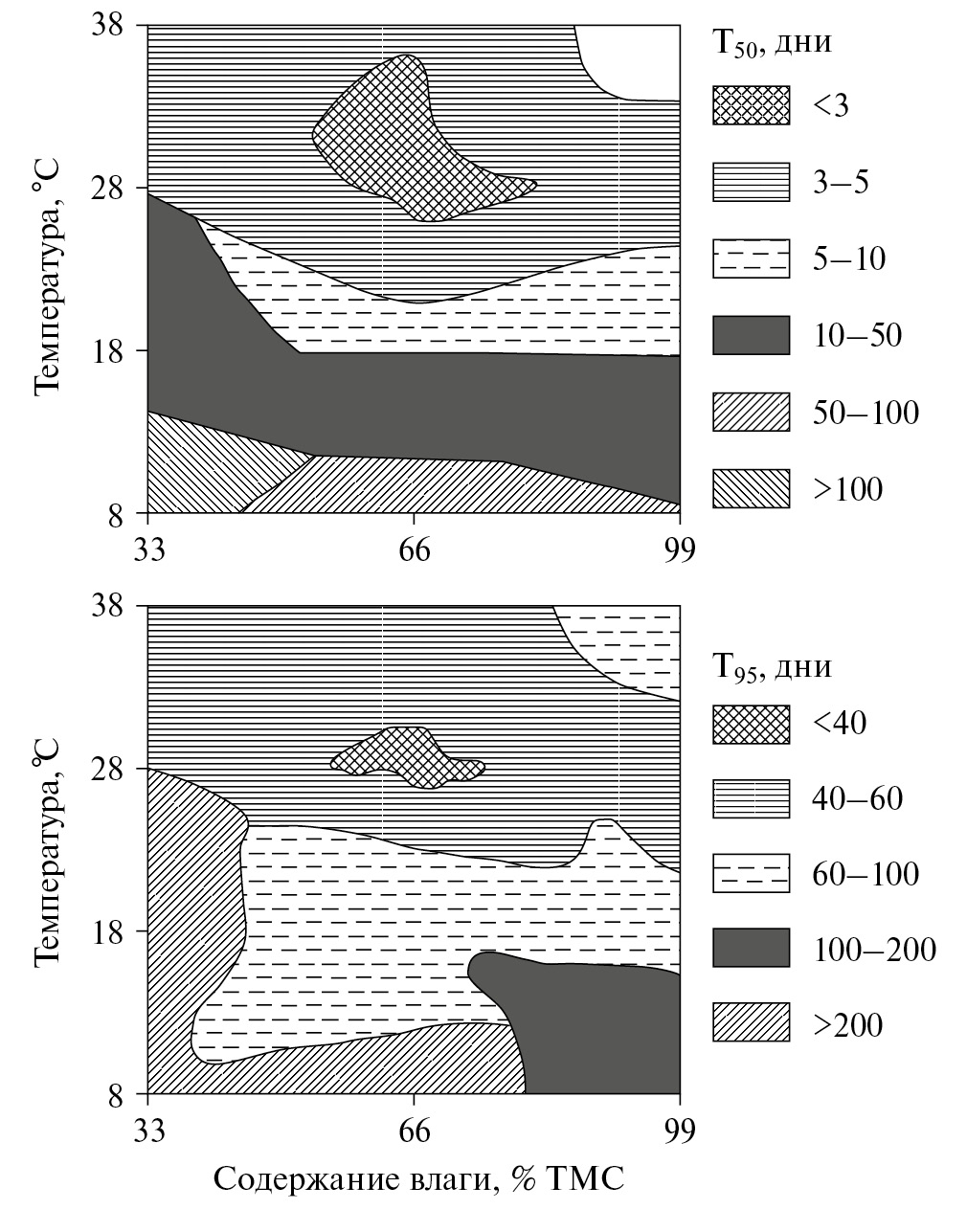 Наиболее полную картину совокупного влияния факторов окружающей среды на биологическую трансформацию и деградацию пестицидов можно получить из экограмм. На рис. 4 представлена экограмма деградации 3,4-дихлоранилина (метаболита некоторых фениламидных гербицидов) в дерново-бледно-подзолистой почве (Беларусь) при нормальных температурах и влажности. Показано ранжирование этих факторов, когда из почвы исчезло 50 и 95% ксенобиотика.