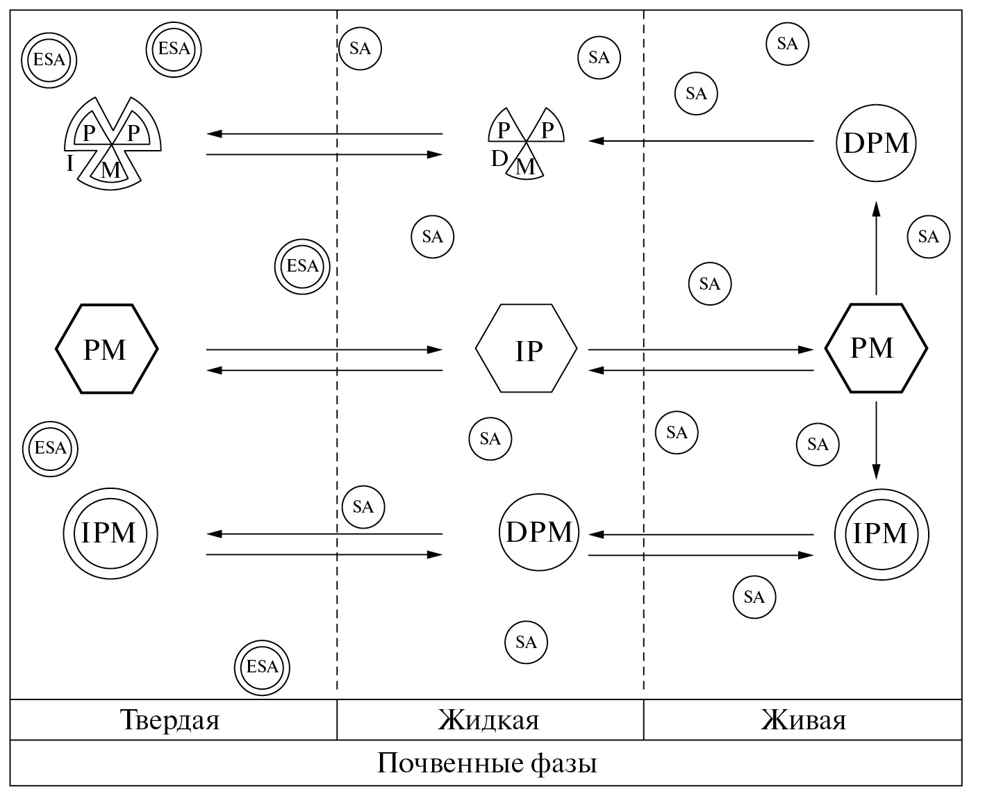 Рис. 5. Трансформация и деградация пестицида в почве: DP – растворенный пестицид, IP – обездвиженный пестицид, PM – метаболит пестицидов, DPM – растворенный метаболит пестицидов. IPM представляет собой иммобилизованный метаболит пестицидов, DPM – растворенный конечный метаболит пестицидов, IPM – иммобилизованный конечный метаболит пестицидов, SA – почвенный воздух, ESA находится в ловушке почвенного воздуха.