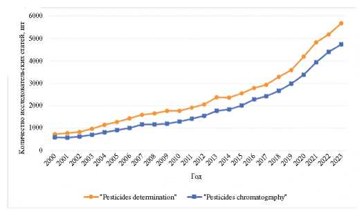 По данным Продовольственной и сельскохозяйственной организации ООН, использование пестицидов за последние 30 лет выросло более чем в 2 раза [2]. В связи с этим актуальность проблемы определения пестицидов с каждым годом возрастает. Это подтверждается проведенным анализом литературы, представленной на платформе ScienceDirect.com: количество исследовательских статей по запросу “определение пестицидов” выросло с 739 в 2000 г. до 5861 в 2023 г. (рис. 1).