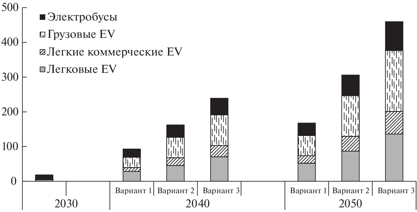 The article assesses the impact of potential motor transport sector electrification on the value of the aggregate demand for electricity and capacity in the UES of Russia. Despite official documents suppose quite modest quantitative targets for the electric transport until 2030, in the longer term, a large-scale replacement of oil fuel with electricity will have a significant effect on reducing greenhouse gas emissions, but will also require a more intensive development of generating and network capacities in the electric power industry. The scenaric forecast for the development of electric transport is made with the allocation of three segments - cars, trucks and buses, which allows taking into account the characteristics of electricity consumption characteristic of each of them. Another important result is an assessment of the possible extent of the influence of electric transport on the configuration of a typical daily load curve. The paper considers various modes of using infrastructure for electric transport charging, which result in different daily load curves. It is shown that, depending on the scales of electric transport development, their annual electricity consumption in the country will lay in the diapason from 168 to 460 TWh. At the same time, depending on the charging mode of electric vehicles, the additional power demand will vary from 26 to 74 million kW, and the amplitude of fluctuations in the hourly loads of electric vehicles will vary from two to four times.