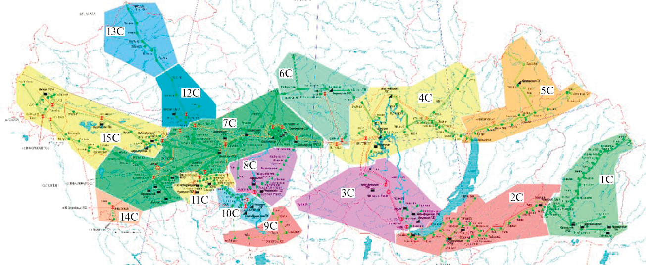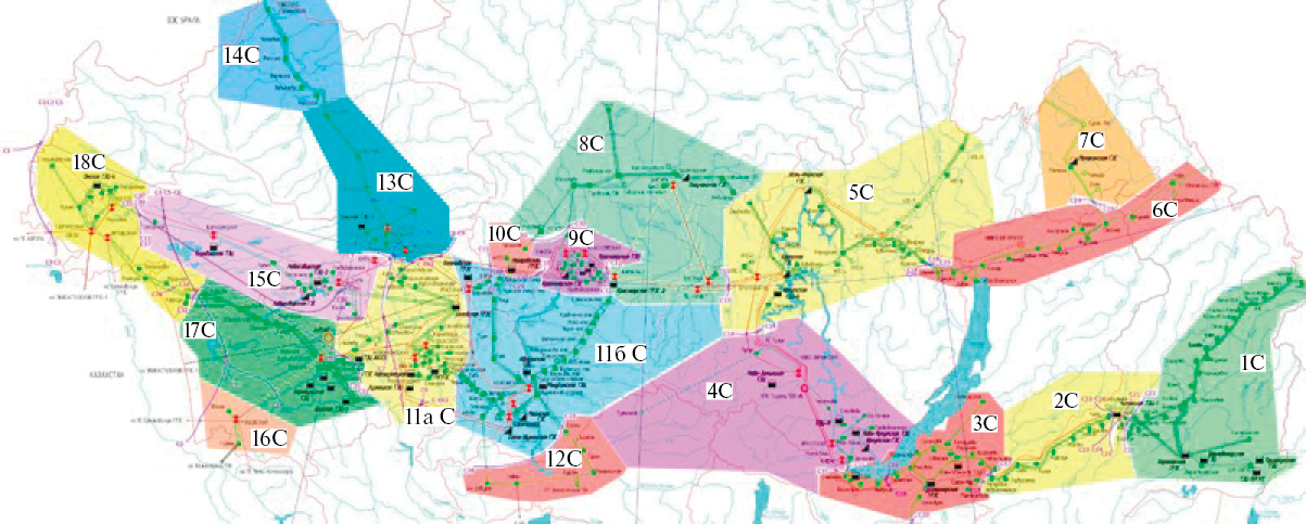 Рис. 2. Кластеризация ОЭС Сибири на зоны надежности по контролируемым сечениям