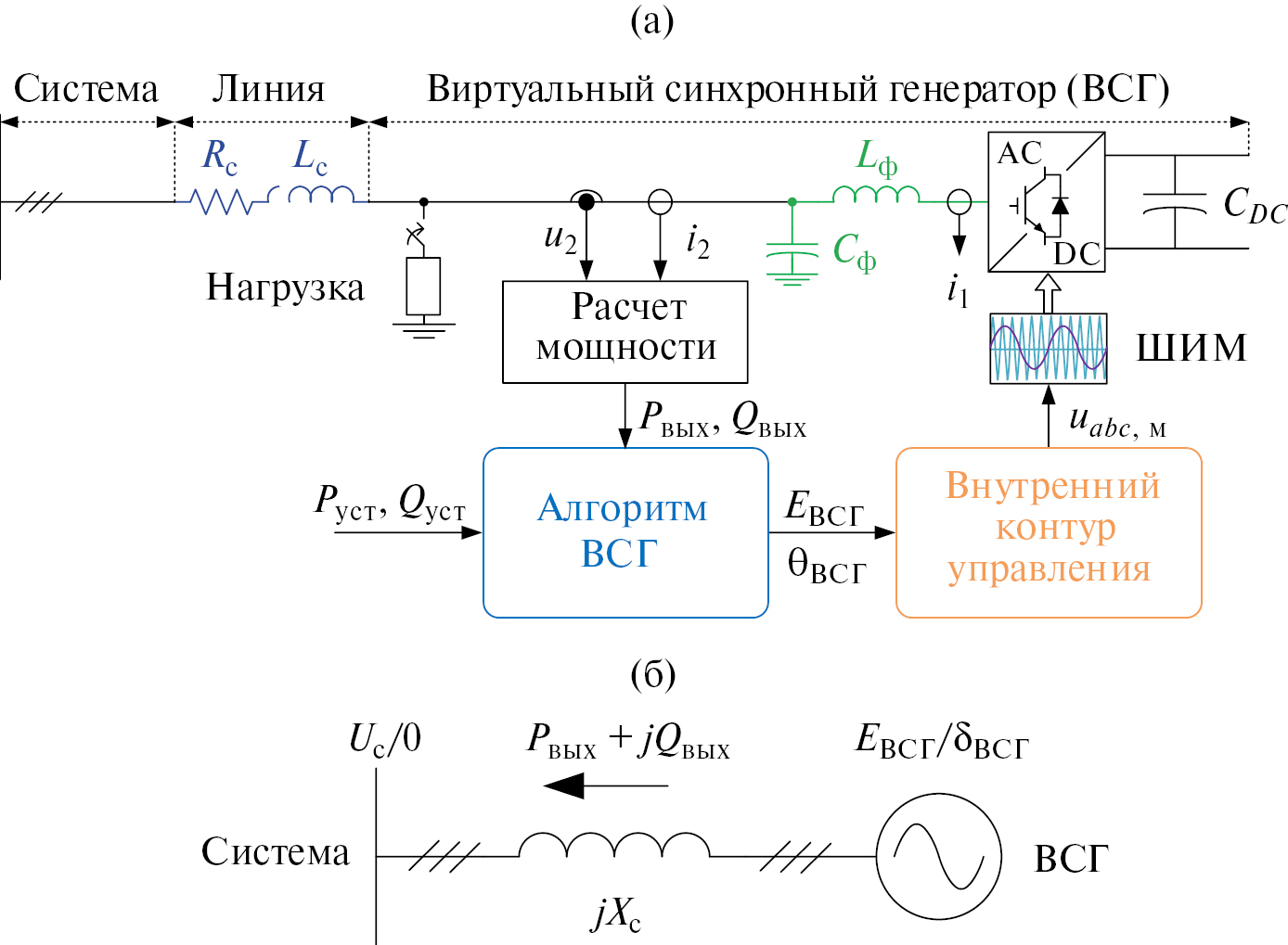 Общий вид исследуемой электрической сети с системой управления СП на основе ВСГ и ее упрощенное представление приведены на рис. 1. СП подключается к сети в точке общего подключения через LC-фильтр, который состоит из индуктивности Lф и емкости Cф. В данной статье с целью исключения детального описания конкретных принципов практической реализации первичного источника энергии, в роли которого может выступать, например, накопитель электрической энергии, и вводимых при этом особенностей функционирования принято, что в цепи постоянного тока инвертора подключен идеальный источник постоянного напряжения UDC через конденсатор CDC. Подобный подход широко используется при разработке алгоритмов управления силовыми преобразователями и позволяет получить обобщенные результаты без привязки к конкретному объекту генерации. Для уменьшения громоздкости уравнений рассматривается только индуктивная составляющая общего сопротивления связи между СП и внешней сетью Lс (Rс = 0). Внешняя энергосистема представлена в виде идеального источника переменного напряжения Uс, определяющего частоту сети ωс. Параметры тестовой схемы приведены в табл. 1.