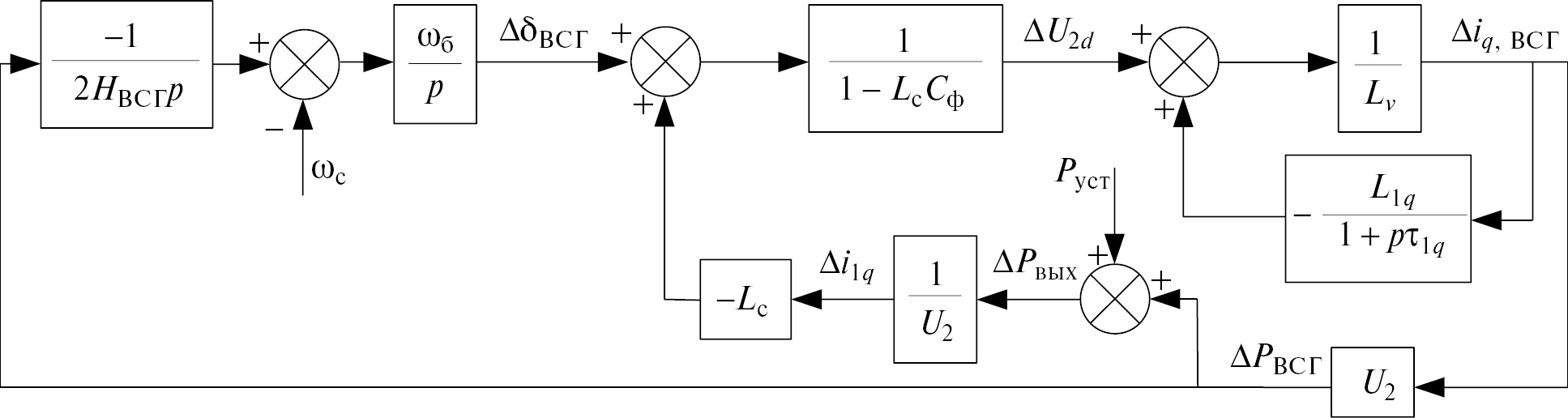 Для формирования замкнутой передаточной функции контура по управлению активной мощностью ВСГ-Т выполним линеаризацию уравнений (1)–(8) в рассматриваемой точке равновесия и преобразование Лапласа. При этом примем ряд допущений, аналогичных случаю ВСГ-Н: