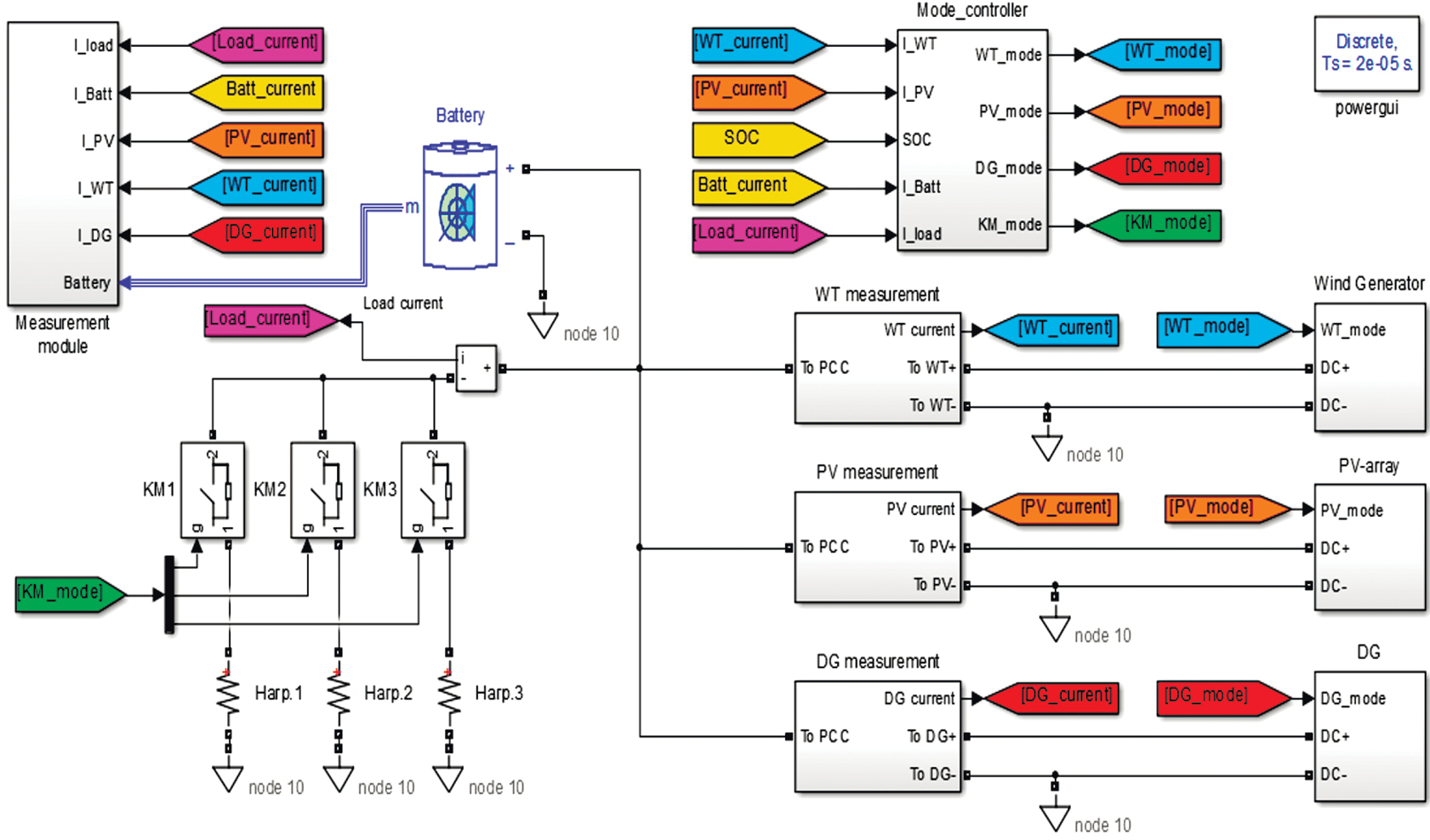 Схема Matlab модели ГЭК состоит из моделей источников с полупроводниковыми преобразователями (PV-array, Wind Generator, DG, Battery), блоков измерений параметров модели (Measurement module, WT measurement, PV measurement, DG measurement), нагрузки (Нагр.1, Нагр.2, Нагр.3), управляемых коммутационных аппаратов (KM1, KM2, KM3), а также контроллера режимов работы (Mode_controller).