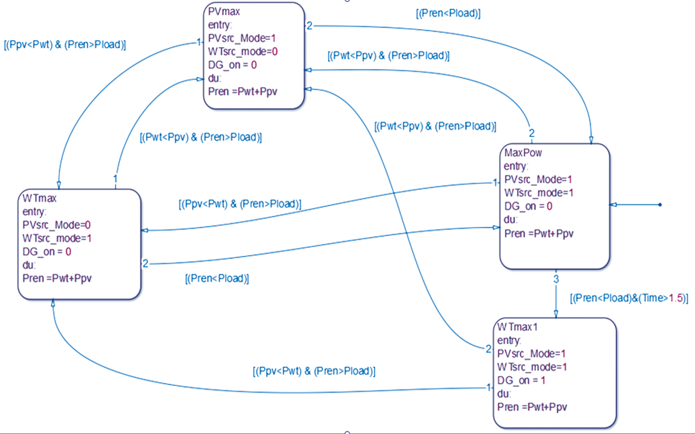 Модель контроллера режимов работы, выполненная в редакторе Matlab/StateFlow (рис. 2), реализует управление режимами работы ГЭК на основе значений токов каждого из элементов системы (ФЭГ, ВЭУ, ДГУ), а также степени заряда АБ.