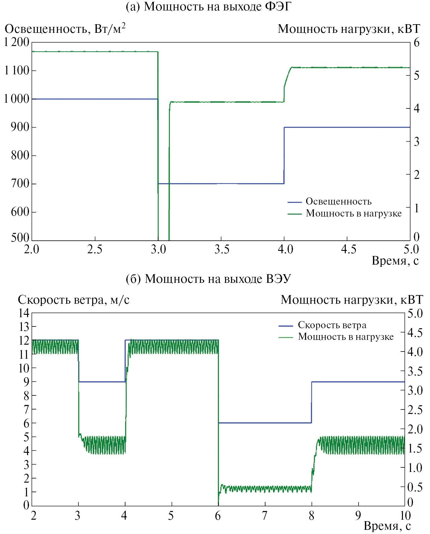 На рис. 6 в качестве примера представлены диаграммы мощностей на выходе полупроводниковых преобразователей, а также мощность нагрузки для одного из анализируемых режимов, когда ГЭК работает на 30% мощности нагрузки (1.5 кВт), при этом происходит изменение режимов работы как ФЭГ, так и ВЭУ.