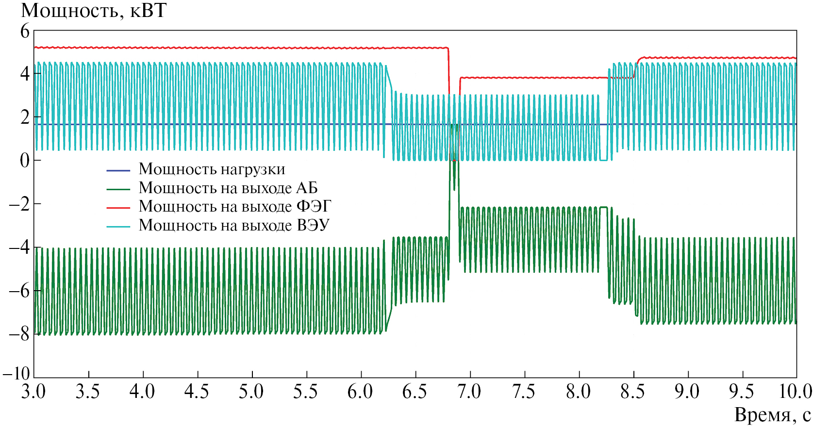 В этом опыте последовательность коммутации нагрузки выглядит следующим образом. В начальный момент времени суммарная мощность нагрузки составляет 2.5 кВт, в момент времени t = 3 с происходит подключение дополнительной нагрузки и ее мощность возрастает до 7.5 кВт, затем в момент времени t = 3.5 с происходит снижение мощности нагрузки до 2.5 кВт. При этом основной задачей ГЭК является демпфирование скачка мощности нагрузки за счет получения дополнительной мощности из АБ на время увеличения мощности нагрузки. Время переходного процесса составило 0.15 с при работе на полную мощность и изменении режима работы ФЭГ.