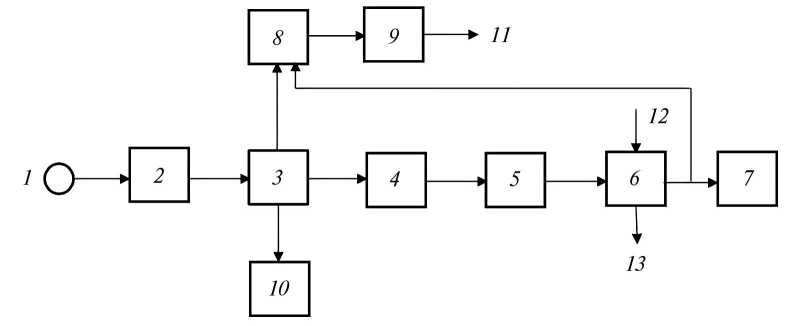 Рис. 3. Технологическая схема комплексного освоения высокотемпературных геотермальных рассолов: 1 – геотермальная скважина; 2 – сепаратор–пароотделитель; 3 – паровая турбина; 4 – генератор; 5, 6 – теплообменник; 7 – турбина на низкокипящем рабочем теле; 8 – конденсатор; 9 – циркуляционный насос; 10 – на водохозяйственные цели; 11 – завод по извлечению химических компонентов; 12 – опресненная вода; 13 – подвод низкотемпературного теплоносителя; 14 – на теплоэнергетические нужды.