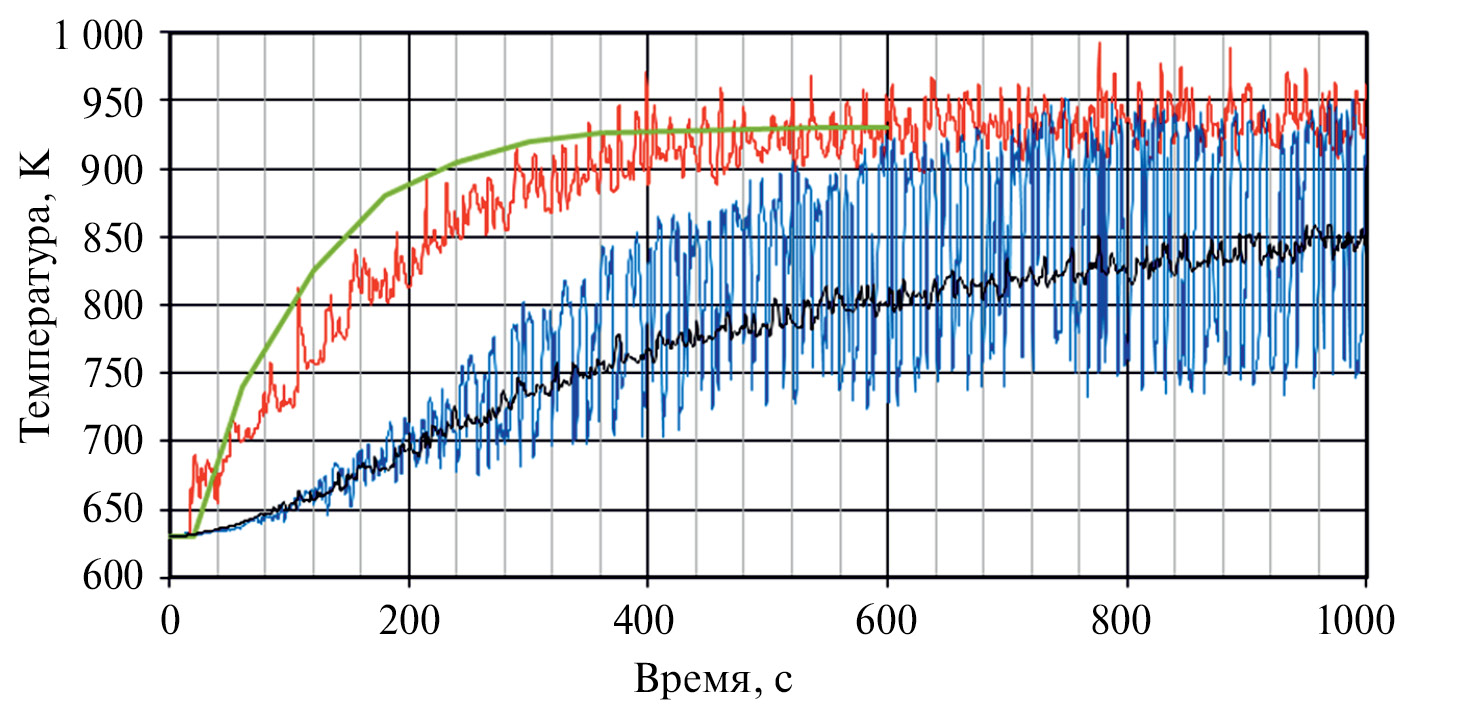 На рис. 6 показаны зависимости температуры среды от времени в точке, расположенной в центре горячего коллектора. В расчете с расходом подачи 1 кг/с стационарное значение температуры составило 929 К, а при расходе 2 кг/с температура выросла до 1010 К.
