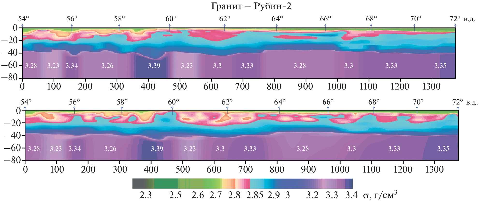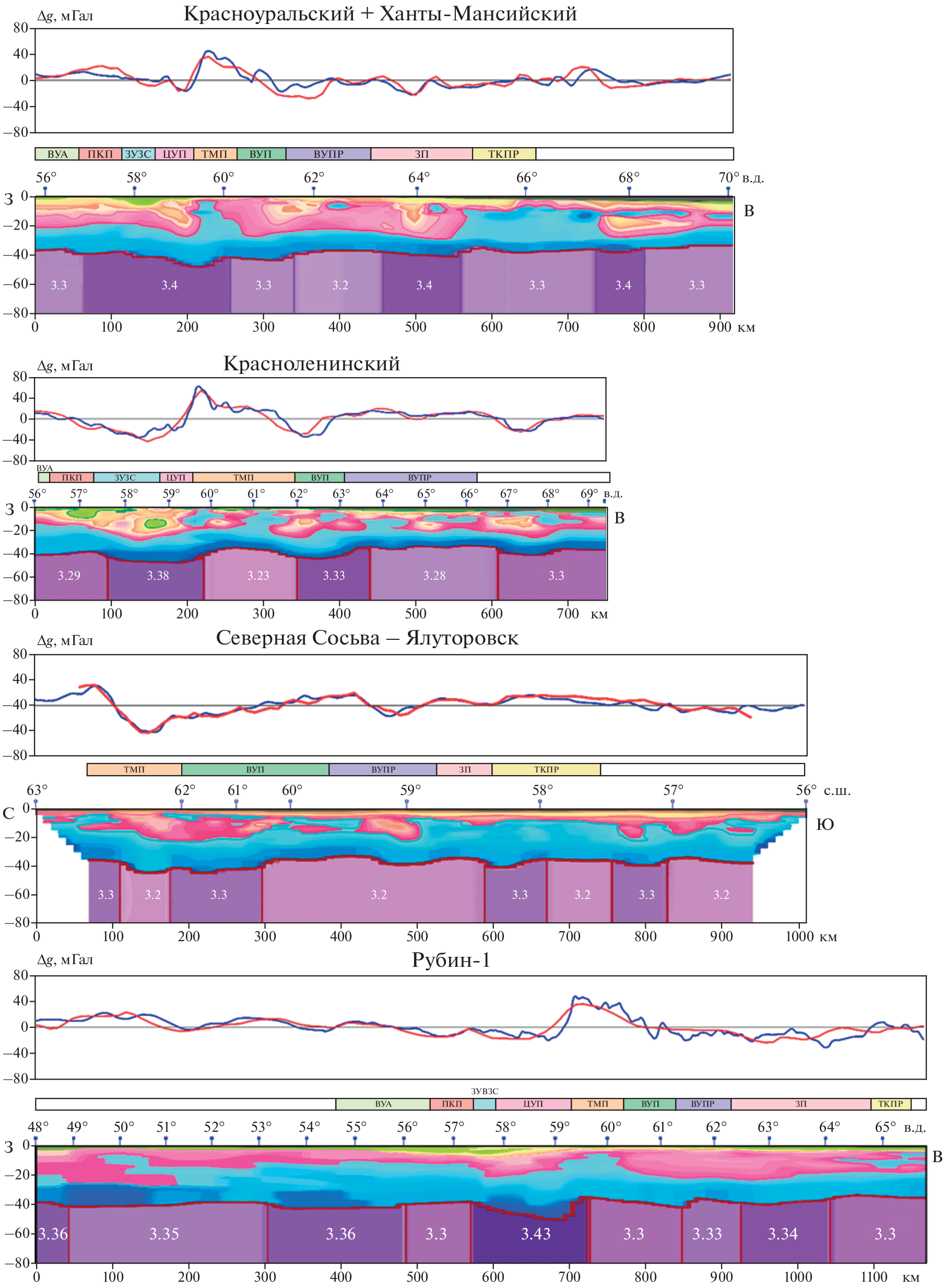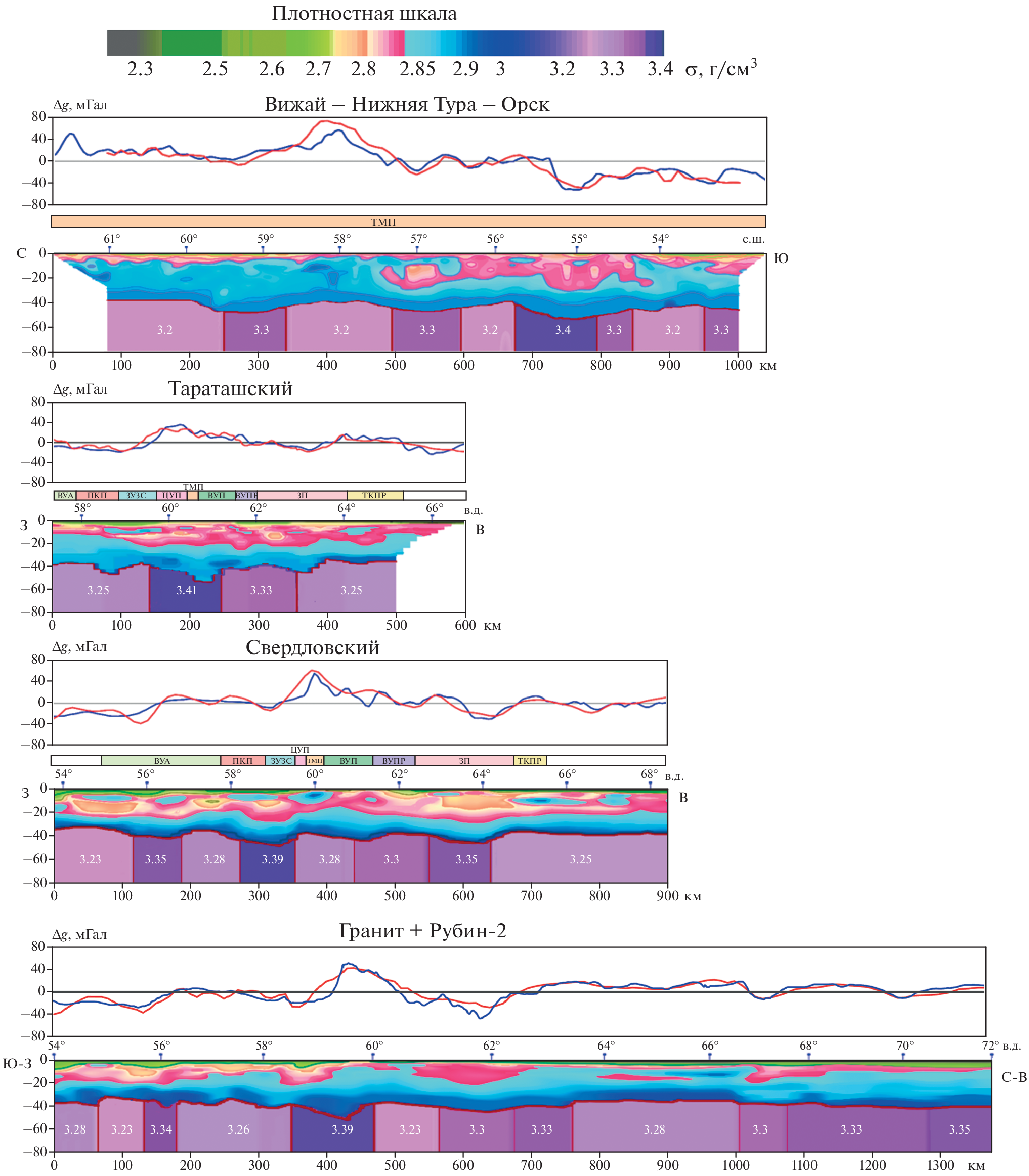 For the Middle and North Urals segments and adjacent territories of the East European Platform and West Siberian Plate (within the graticular trapezoid with geographic coordinates 53–65° N, 48–72° E), ten deep seismic sounding (DSS) profiles were reprocessed using two-dimensional (2D) seismic tomography method, and gradient sections of crustal velocities were constructed in the form of grid functions. In the same format, density sections were constructed. The coefficients of density–velocity empirical correlation were calculated using the solution algorithm of 2D inverse problem of gravimetry. The method and calculation technology of a three-dimensional (3D) density distribution with tying to 2D data from reference seismic sections are embedded in the procedure of quantitative interpretation of potential fields with construction of 3D geophysical models. A stable solution of the 3D inverse problem of gravimetry is sought on the correctness set of the family of horizontal layers with 2D density distribution.