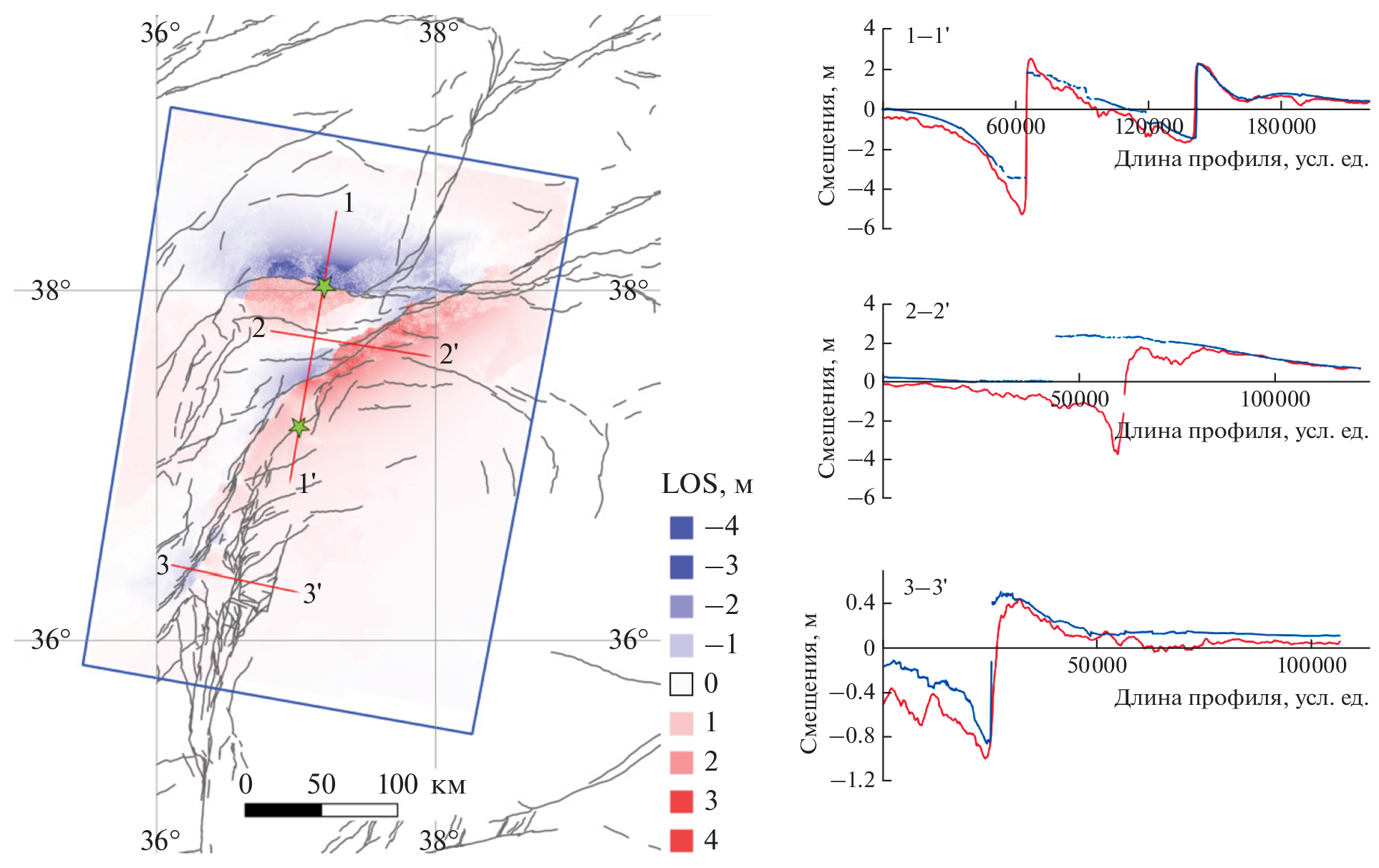 —Using different methods for processing SAR images from the Sentinel-1A satellite, the displacement fields were determined in the region of the East Anatolian Fault Zone (EAFZ) and the Sürgü-Çardak faults, as well as a small fault on the continuation of the East Hatay fault zone, which rupture initiated a series of catastrophic earthquakes in Turkey on February 06, 2023. DInSAR and offset methods were applied. The most detailed data on the displacements were obtained by the offset method using images from the descending orbit. When constructing the model from the available SAR data, the data with the maximum signal-to-noise ratio were selected. For the northern part of the region, above 37.4° N, the range displacements obtained by the offset method from a descending orbit were used. South of parallel 37.0° N, we used azimuth displacements from the same descending orbit. The model of the seismic rupture was constructed on the basis of solution of (Pollitz, 1996) of the problem of deformations at the surface of a layered spherical Earth caused by along dip and strike displacements on a rectangular cut located inside the planet. Pollitz (1996) demonstrated that ignoring the spherical layering of the planet leads to errors up to 20%, with the largest errors occurring in the presence of a large strike-slip component. Ignoring sphericity also introduces an error when using the solution in the framework of the idealization of an elastic homogeneous half-space with a flat free boundary (Okada, 1985) which was used when constructing USGS and (Barbot et al., 2023) models. In our model the surfaces of seismic rupture are approximated by 19 rectangular elements along the strike, divided into three levels along the dip. Another element approximated a rupture along the extension of the East Hatay Fault Zone. As in the models of other authors (USGS; Barbot et al., 2023), in our model in the southern part of the EAFZ, the displacements increase from south to north, and are mainly concentrated in the upper part of the Earth’s crust to a depth of 10 km. At the southern end of this rupture, displacements in our model with an amplitude of up to 2 m are obtained at the lower levels of the model, and at its upper level, the displacements were only 0.11 m, and in this area on February 20, 2023 an earthquake of magnitude 6.3 occurred with a hypocentre depth of 11.5 km. The main displacements on the EAFZ are determined on its central segment. Here, the displacements go to a greater depth, their value reaches 10.2 m. On the Sürgü-Çardak fault, significant displacements occurred down to a depth of 20 km; displacements exceeded 9.8 m. In our model, at the northeast end of the seismic rupture along the EAFZ, a displacement area of 6.8 m overlaps with the southwest end of the seismic rupture model of the Doğanyol-Sivrice earthquake of January 24, 2020 with Mw 6.7, published on the USGS website. Therefore, our model does not confirm the hypothesis of the presence of a seismic gap here, which, according to (Barbot et al., 2023), is a zone of a possible nearest earthquake.