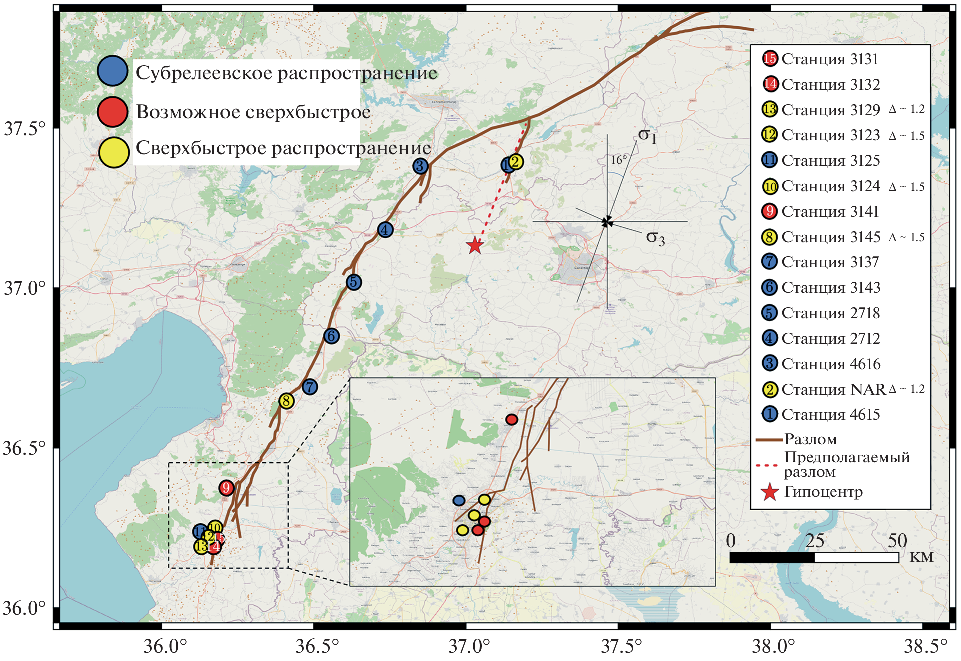 Abstract—An overview of the results obtained by foreign seismologists based on the records of Turkish seismic networks AFAD (State Agency for Disaster Management under the Ministry of Internal Affairs) is presented. The sequence of earthquakes began with the M7.8 main shock and includes thousands of aftershocks. The strongest events occurred in the first twelve hours, with the sources of two M7.0+ events located 100 km apart. Earthquakes have caused ground motions that are destructive to structures, the so-called “pulse-like waveforms”, and epicentral distances, as was previously noted, are not a good indicator of attenuation of waves from earthquakes with extended ruptures. The records of stations in the near-fault zones clearly revealed the directivity effects of seismic radiation. The M7.8 earthquake (main shock) was larger than expected in the current tectonic setting. The near-field records traced an early transition to the super-shear (~1.55Vs) rupture propagation on the Narli lateral fault, where the rupture originated and then passed into the East Anatolian fault. The early transition to the super-shear stage obviously contributed to the further propagation of the rupture and the initiation of slips on the East Anatolian fault. A dynamic fracture model has been constructed that matches the various results of inversions obtained by different authors and reveals spatially inhomogeneous rupture propagation velocities. Super-shear velocities exceeding the shear wave velocity Vs are observed along the Narli lateral fault and at the southwestern end of the East Anatolian fault. Since the late 1990s, seismologists have been working on incorporating the rupture directivity effects of extended sources into the probabilistic seismic hazard analysis procedures, but no consensus has been reached so far, and progress in this area can only be expected with the accumulation of a sufficient amount of observational data.