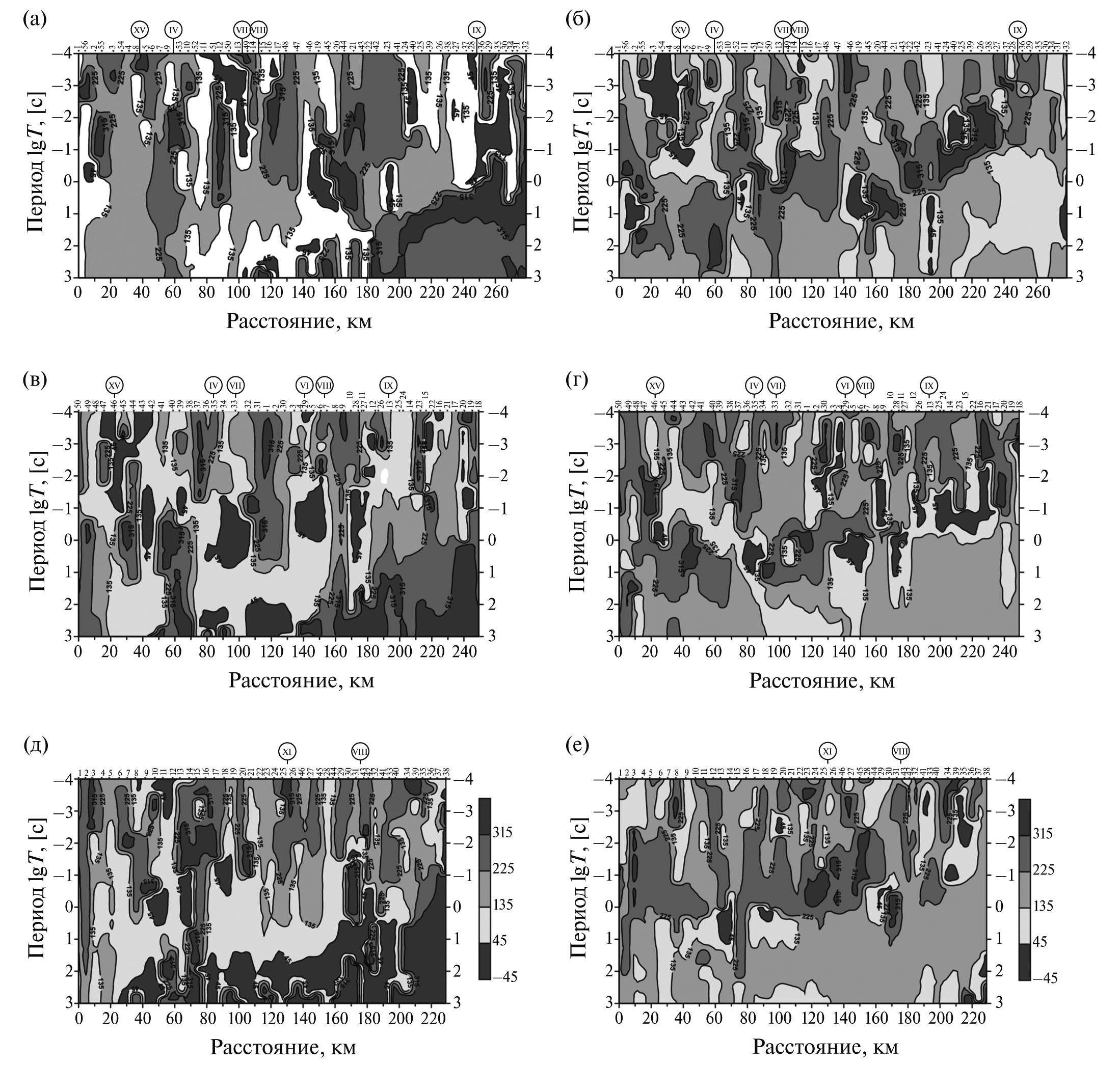 На рис. 6 показаны азимуты направлений вещественного (ReW) и мнимого (ImW) типперов в зависимости от периода по профилям. На рисунках видно, что в области периодов свыше 1 с, начиная от прибрежных пунктов, наблюдается область устойчивых направлений вещественного типпера, которая как бы погружается в сторону континента при увеличении периода (рис. 6а, 6в, 6д). Такая же тенденция наблюдается и в поведении мнимого типпера, но начиная с период свыше 0.1 с (рис. 6б, 6г, 6е). При этом на вещественных типперах это прослеживается на расстоянии около 100 км на профилях ДП и СЗ и около 200 км на профиле АВ. На мнимых типперах такая тенденция наблюдается на протяжении всей длины профилей и их азимуты, в основном, имеют южное направление. Азимуты вещественных типперов меняют свое направление от профиля к профилю. В выделенной области на профиле ДП (рис. 6а) вещественные типперы, в основном, имеют западное–северо-западное направления, на профиле СЗ (рис. 6в) – северное–северо-западное, а на профиле АВ (рис. 6д) – северное–северо-восточное. Таким образом, наличие данных областей с устойчивыми направлениями типперов, во-первых, свидетельствуют о наличии берегового эффекта, во-вторых, о дальности его влияния, в-третьих, о направлении его влияния.