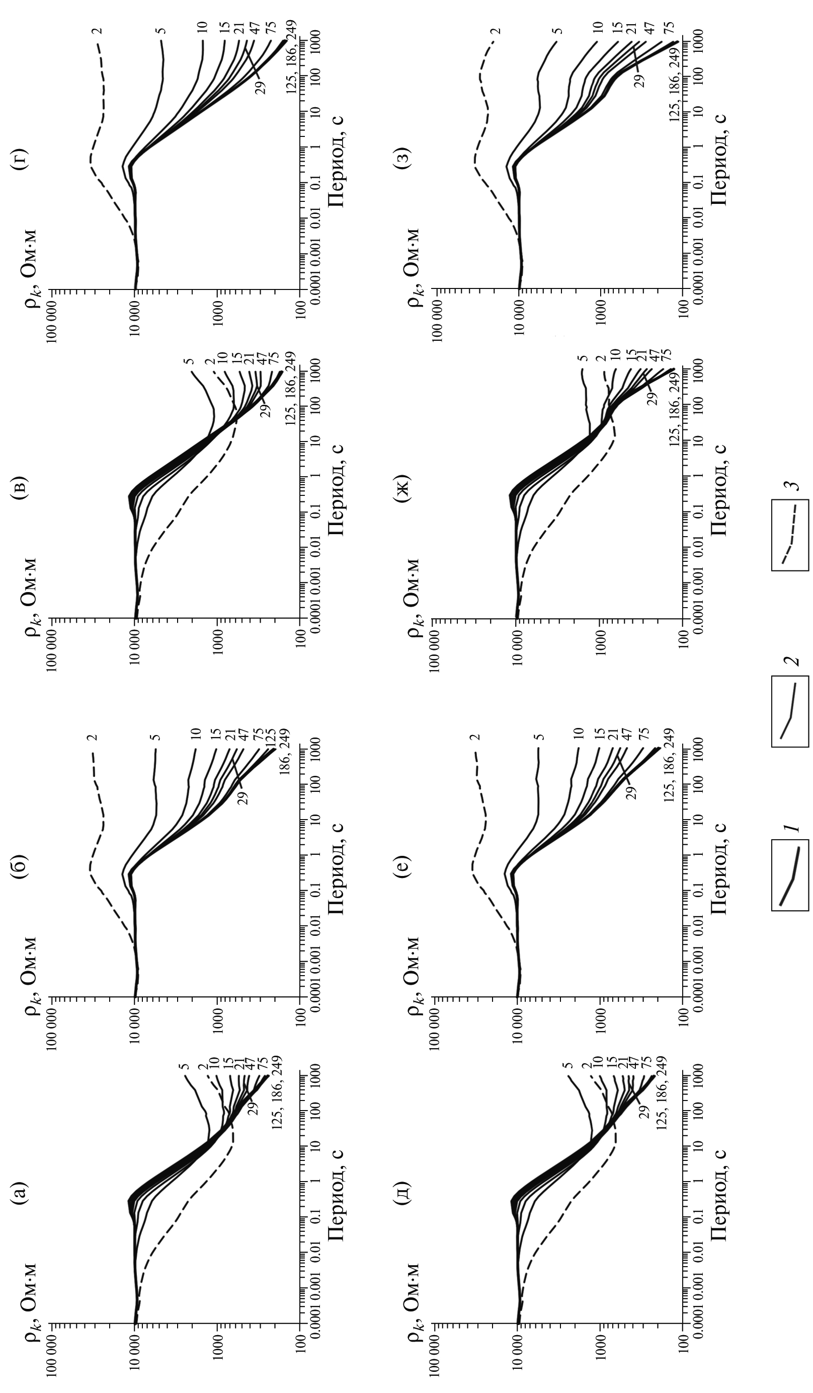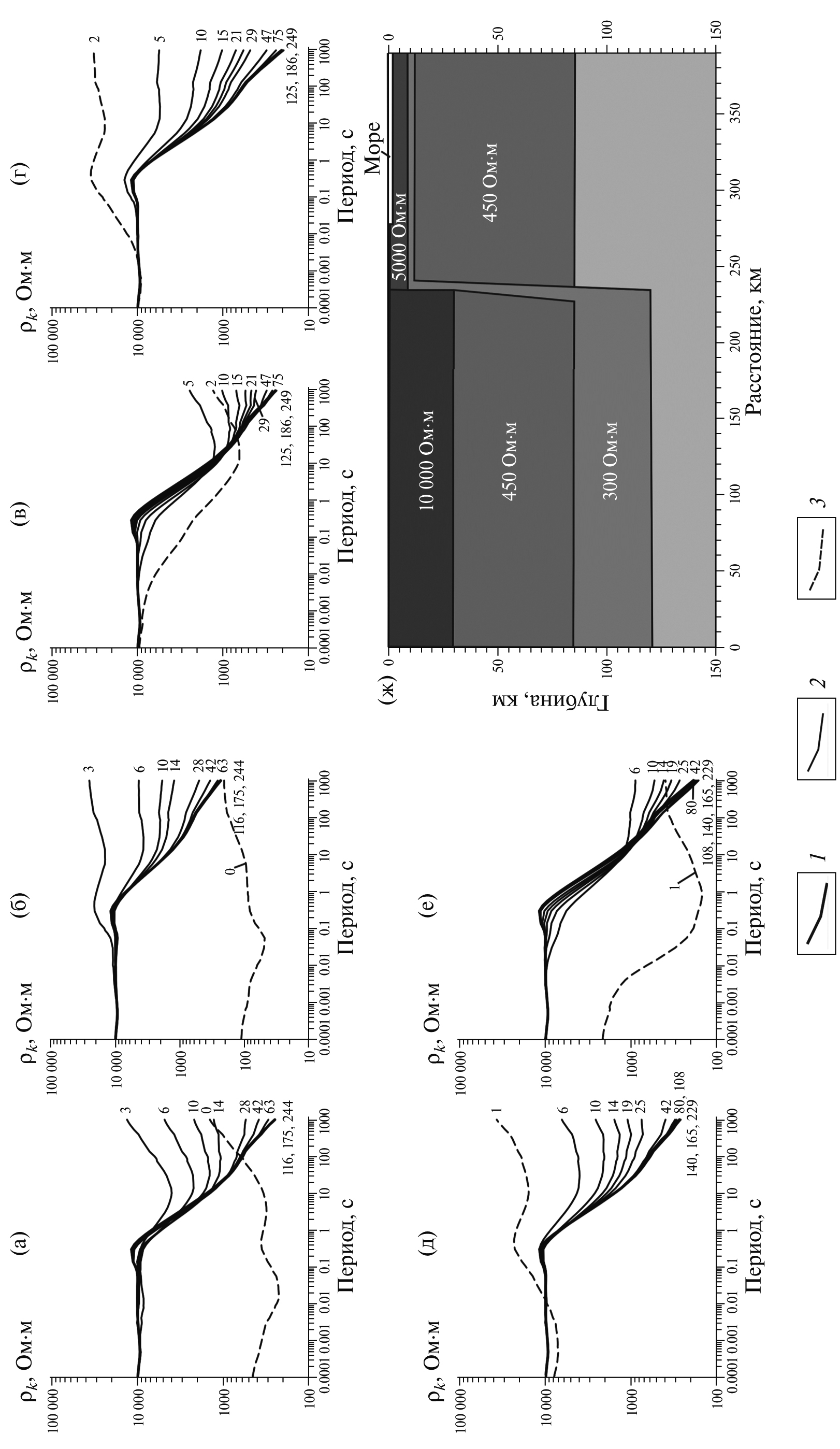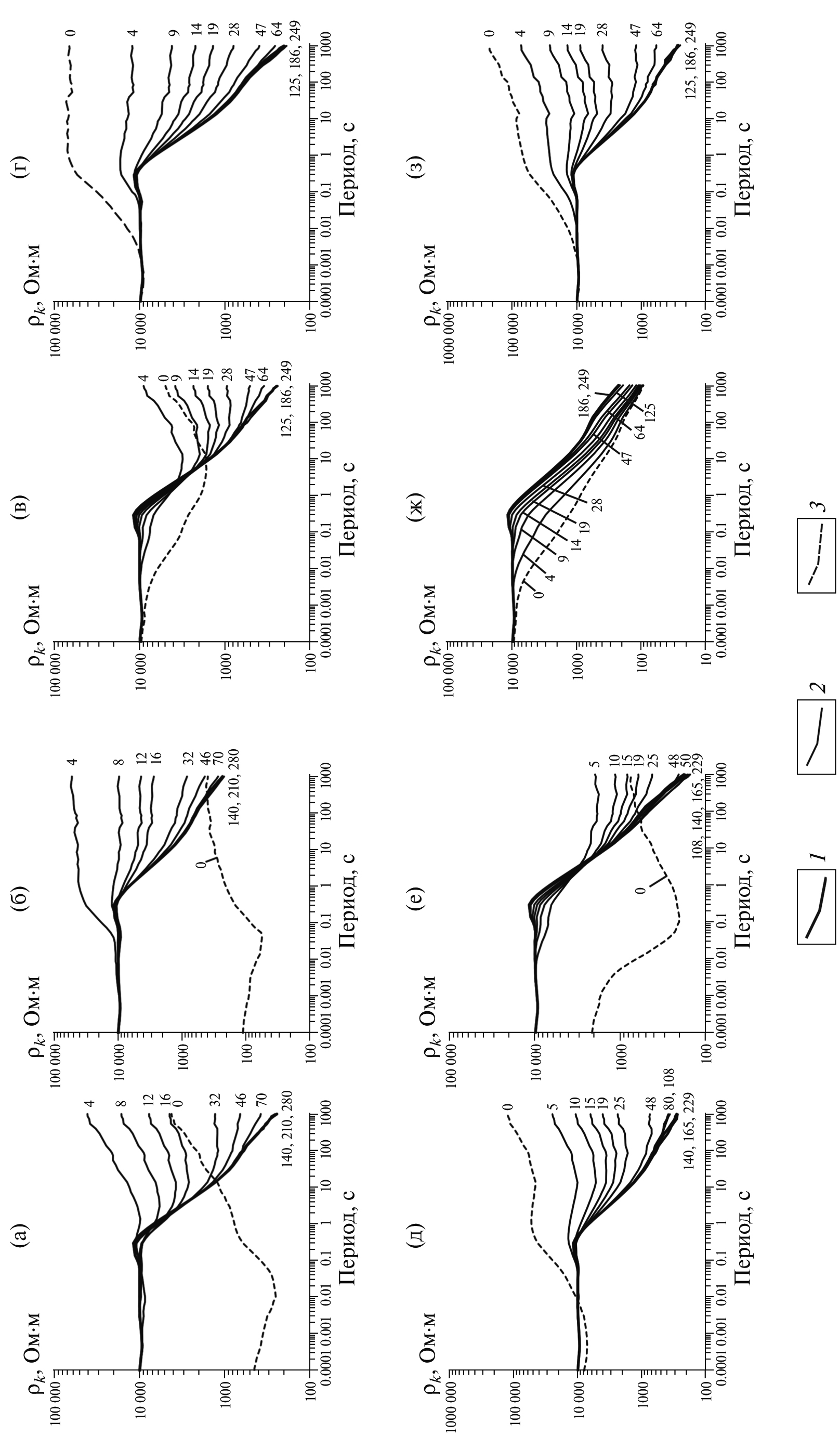 Рис. 7. Расчетные амплитудные кривые ρxy и ρyx для базовой модели с учетом береговой линии и батиметрии по профилям: (а), (б) – ДП; (в), (г) – СЗ; (д), (е) – АВ. Графики (ж), (з) показывают влияние берегового эффекта на амплитудные кривые без учета береговой линии на примере профиля СЗ. Цифры у кривых – расстояние до берега по профилю, в км: 1 – континентальная кривая, 2 – кривые рядовых точек профиля, 3 – кривая береговой точки профиля.