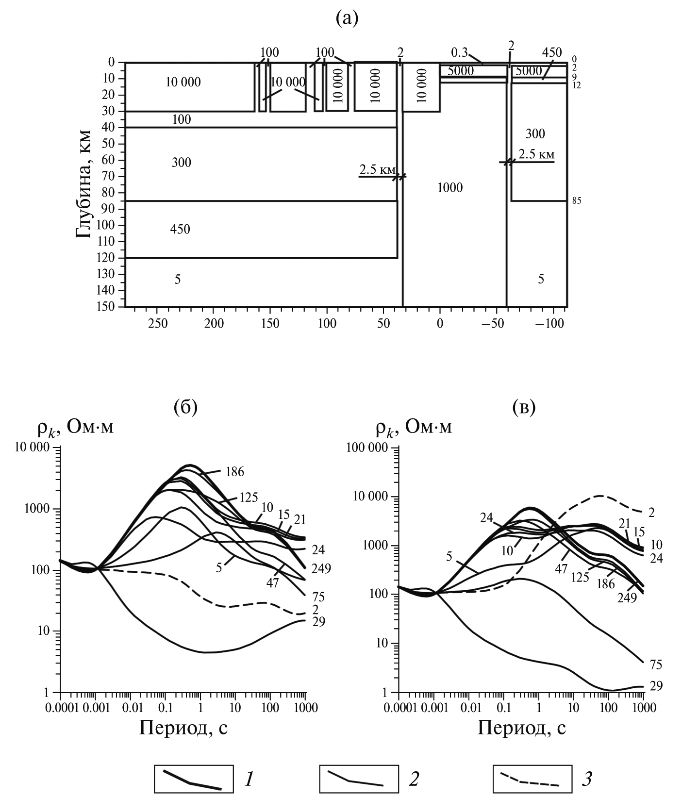 Рис. 13. Геоэлектрический разрез вдоль профиля СЗ с блоком высокого сопротивления в верхней мантии (а) и расчетные амплитудные кривые ρxy (б) и ρyx (в). Цифрами на разрезе указано удельное электрическое сопротивление в Ом · м. Цифрами на кривых показано расстояние от берега моря. Берег моря равен нулевой отметке расстояния рис. 12а.