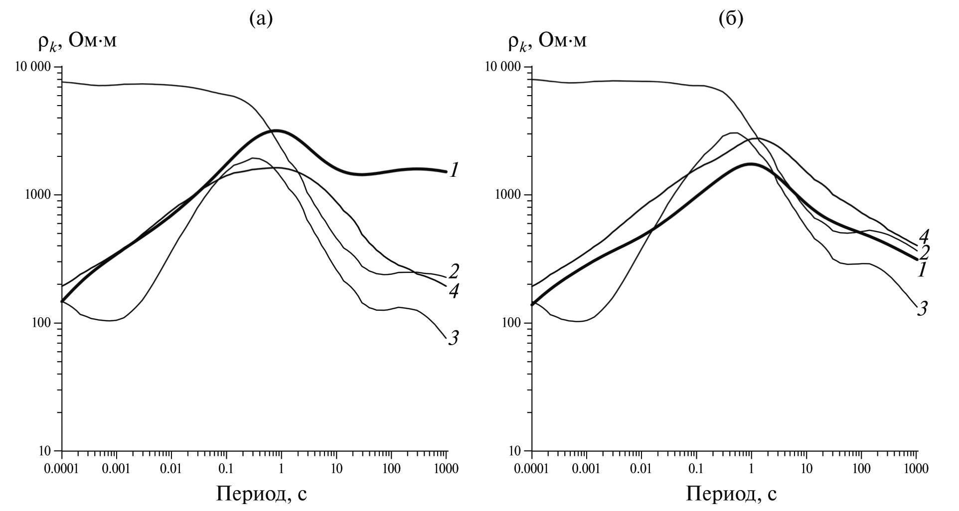 1 – средняя кривая по данным полевых измерений, 2 – средняя кривая от базовой модели с континентальными разломами сопротивлением 2 Ом · м, 3 – средняя кривая от базовой модели с континентальными и морским разломами сопротивлением 2 Ом · м, 4 – средняя кривая от модели по которой рассчитывались векторы Визе представленные на рис. 14.