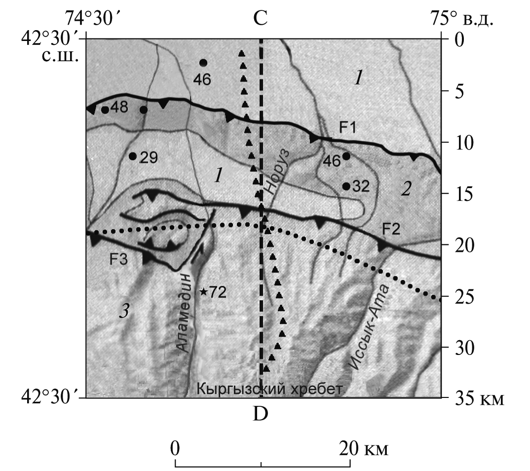 Зона сочленения Чуйской впадины и Кыргызского хребта с юга граничит с серией субширотных складок, расположенных в северной части Кыргызской мегаантиклинали, а с севера – с Чуйской моноклиналью Восточно-Чуйской впадины, являющейся частью обширной Чу-Сарысуйской системы прогибов. Основными разрывными нарушениями на рассматриваемой площади (рис. 1) являются Шамси-Тюндюкский (F1), Иссык-Атинский (F2) и Чонкурчакский (F3) разломы, входящие в состав Северо-Тяньшаньской системы разломов [Садыбакасов, 1990; Абдрахматов и др., 2001].