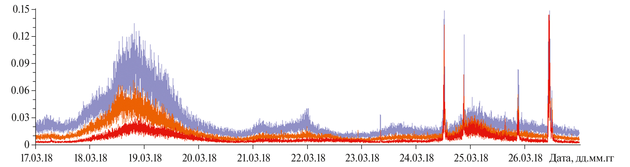 Для оценки степени затухания шумового воздействия на гравиметрические измерения рассмотрим величину помех на проведенных ранее синхронных измерениях в Мурманске и Обнинске [Абрамов и др., 2020]. СКО измерений в Обнинске разделено по интенсивности, аналогичной измерениям во Владимире (рис. 4). У берегов Норвегии 18.03.2018 г. зафиксирован шторм с высотой волн, превышающей 7 м, направленных в сторону берега. Далее наблюдается синхронное снижение зашумленности, до вечера 24 марта, когда в Обнинске происходит повышение СКО, вероятно связанное с прохождением антициклона, вызвавшего увеличение атмосферного давления примерно на 10 мБар.