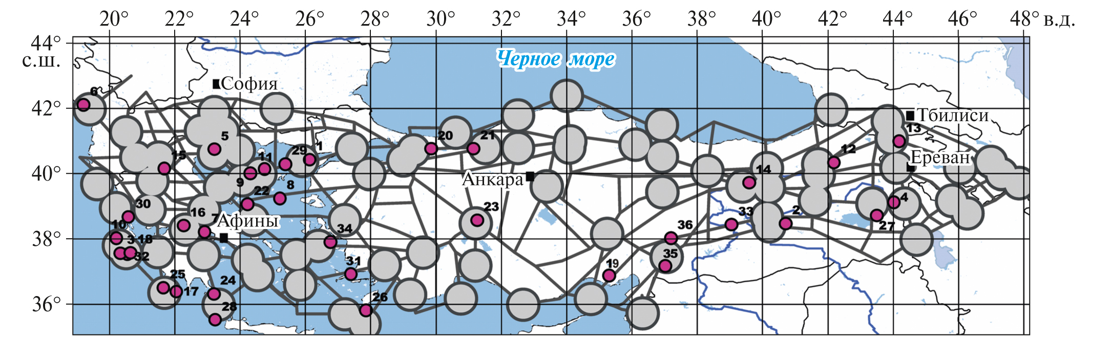 Рис. 1. Схема линеаментов Анатолии и прилегающих регионов и распознанные высокосейсмичные узлы для M ≥ 6.5. Высокосейсмичные пересечения В показаны серыми кругами радиусом 40 км. Эпицентры землетрясений с M ≥ 6.5, произошедших после 1974 г., показаны сиреневыми точками с номерами, соответствующими номерам в таблице).