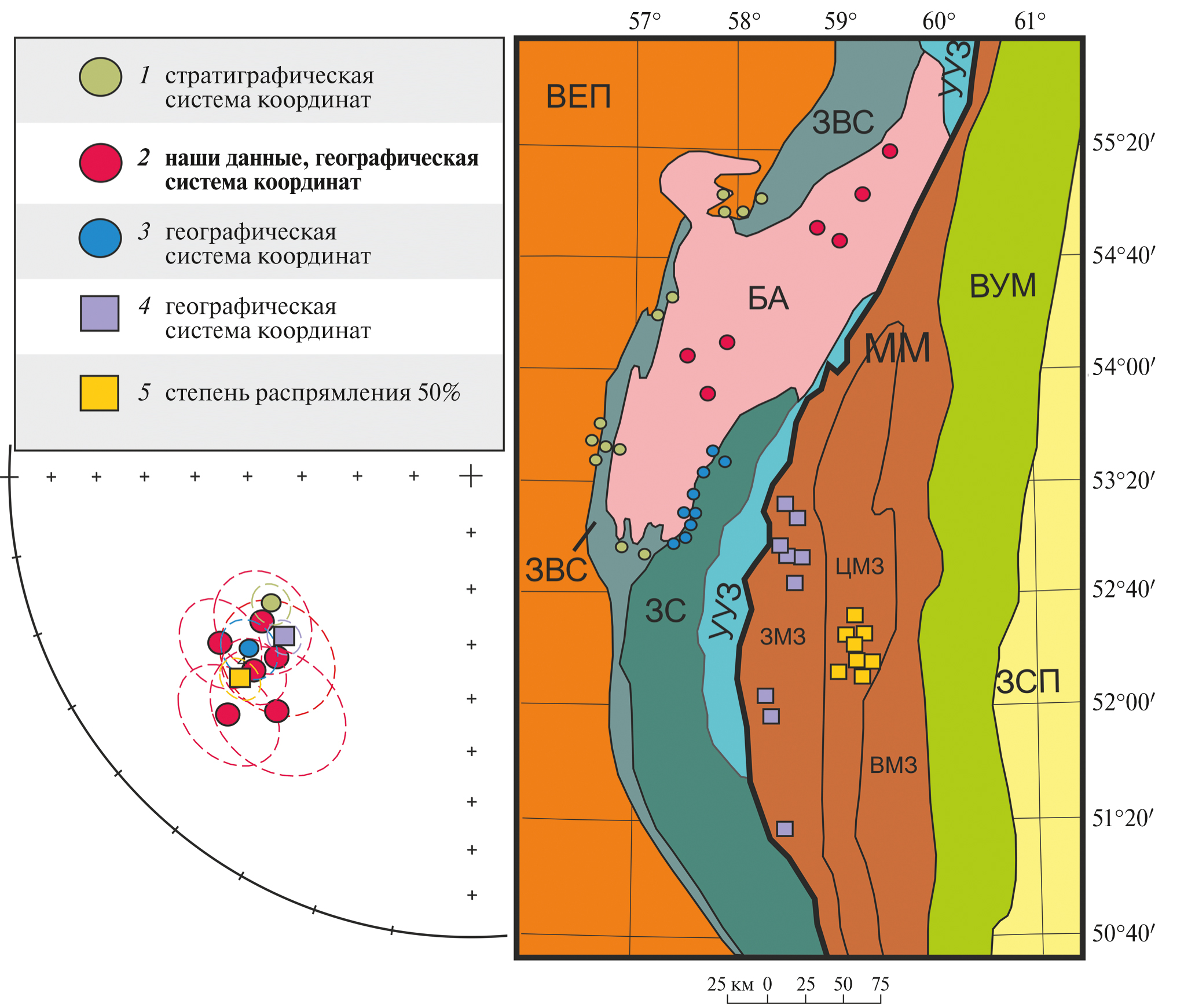 Башкирский антиклинорий (БА) – крупная тектоническая зона субмеридионального простирания в складчатой системе Южного Урала. На западе через зону краевых надвигов БА граничит с Восточно-Европейской платформой (ВЕП). На юго-юго-востоке Башкирский антиклинорий граничит с Зилаирским синклинорием, на юго-востоке с Уралтауским антиклинорием, на востоке с Магнитогорской мегазоной через Главный Уральский разлом, на северо-востоке с Уфалейским антиклинорием (согласно геологическим картам [Козлов и др., 2001; Князев и др., 2013]; рис. 1).