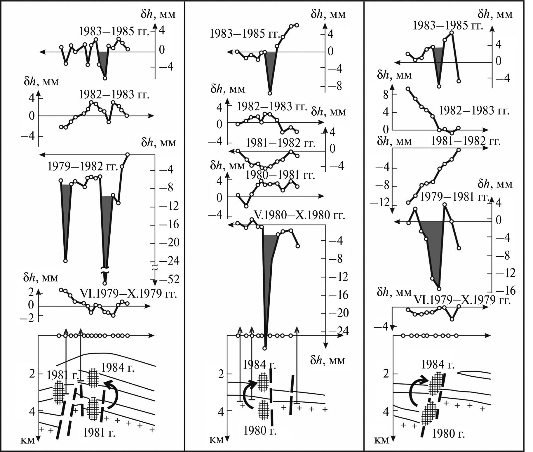 Модель Эльзассера практически сразу была применена для описания миграции деформаций и землетрясений [Bott, Dean, 1973; Anderson, 1975], а в дальнейшем – и для объяснения сопутствующих эффектов [Баранов, Лобковский, 1980; Баранов и др., 1989; Rydelek, Sacks, 1988; Press, Allen, 1995; Pollitz et al., 1998].