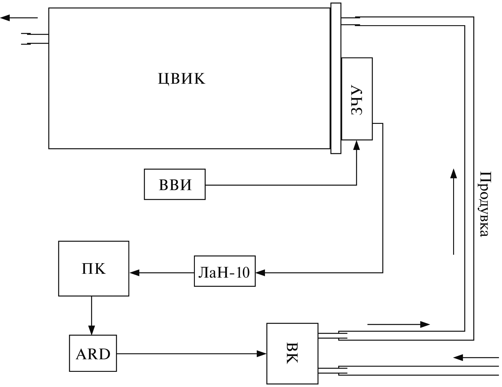 Рис. 1. Блок-схема монитора для контроля содержания радона в воздухе на базе цилиндрической воздушной импульсной ионной ионизационной камеры: ЦВИК – ионизационная камера, ЗЧУ – зарядочувствительный предусилитель, ВВИ – высоковольтный источник питания, ПК – персональный компьютер, ARD – программно-релейная управляющая плата ARDUINO, ЦОС – цифровой осциллограф ЛА-н10-12PCI, ВК – воздушный компрессор.