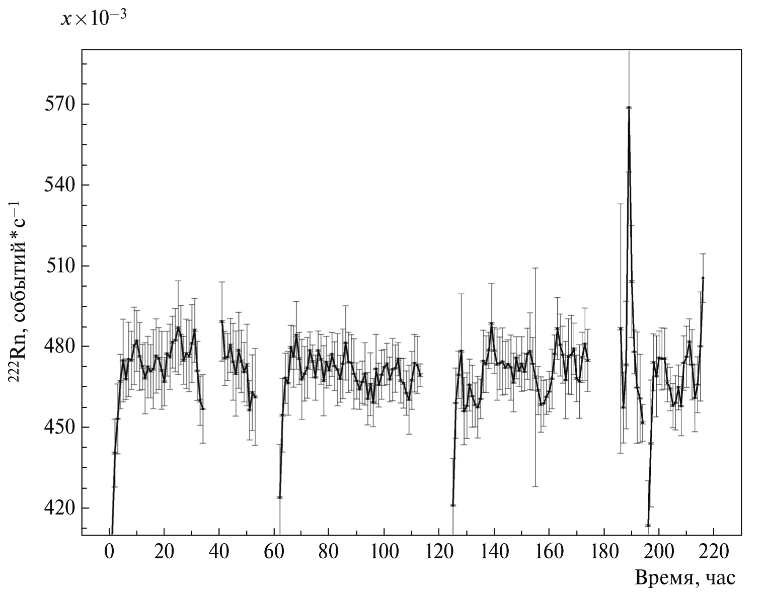 Статистическая ошибка средних значений не превышает 5–10%. Однако амплитуда вариаций значительно превосходит ее. Поэтому неопределенность, вносимая вариациями, может быть выражена в виде случайной ошибки. Заданные в такой форме средние значения в зависимости от расстояния между входом в штольню и точкой измерения представлены на рис. 8. Из данных видно, что содержание радона в потоке воздуха на протяжении 0–1420 м в пределах ошибок не меняется. А на отрезке 1420–3700 м содержание увеличивается примерно в 3 раза. Такое поведение можно объяснить, если предположить, что в штольне между отметками 1420 и 3700 м имеются точечные источники радона. Для проверки этого предположения на отметках 2000, 2600, 2800, 3000, 3400 м были взяты пробы воздуха непосредственно в объем ЦВИК, использованной в качестве переносного пробоотборника. Измерения проводились в оптимальных для работы аппаратуры условиях в точках (3) или (4). Поскольку измерения были единичными, в качестве систематической ошибки полученных данных использована ошибка значений в точке (1).