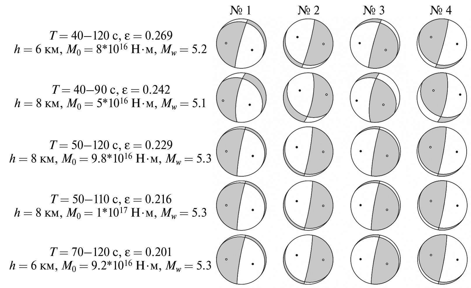 Из рис. 4 видно, что механизмы очага, полученные для рассматриваемого землетрясения в диапазонах периодов 50–120, 50–110 и 70–120 с, абсолютно идентичны между собой. Также для этих диапазонов близки значения глубины и скалярного сейсмического момента. Наиболее сильно от этих решений отличаются параметры, рассчитанные для более коротких периодов (T = 40–90 с). В этом случае крутопадающая плоскость с азимутом простирания strike = 190° и пологая плоскость cо strike = 306° (№ 1 для T = 50–120 с) становятся более пологой и крутой соответственно (№ 1 для T = 40–90 с). Однако даже в этом случае механизмы количественно довольно близки между собой (Φ = 18°). Также можно отметить, что для более длинных периодов наблюдается тенденция к увеличению значений M0 и Mw. Для полного диапазона, в котором были отфильтрованы поверхностные волны (T = 40–120 с) очаговые параметры принимают средние значения относительно оценок для T = 40–90 с и T = 50–120 с.