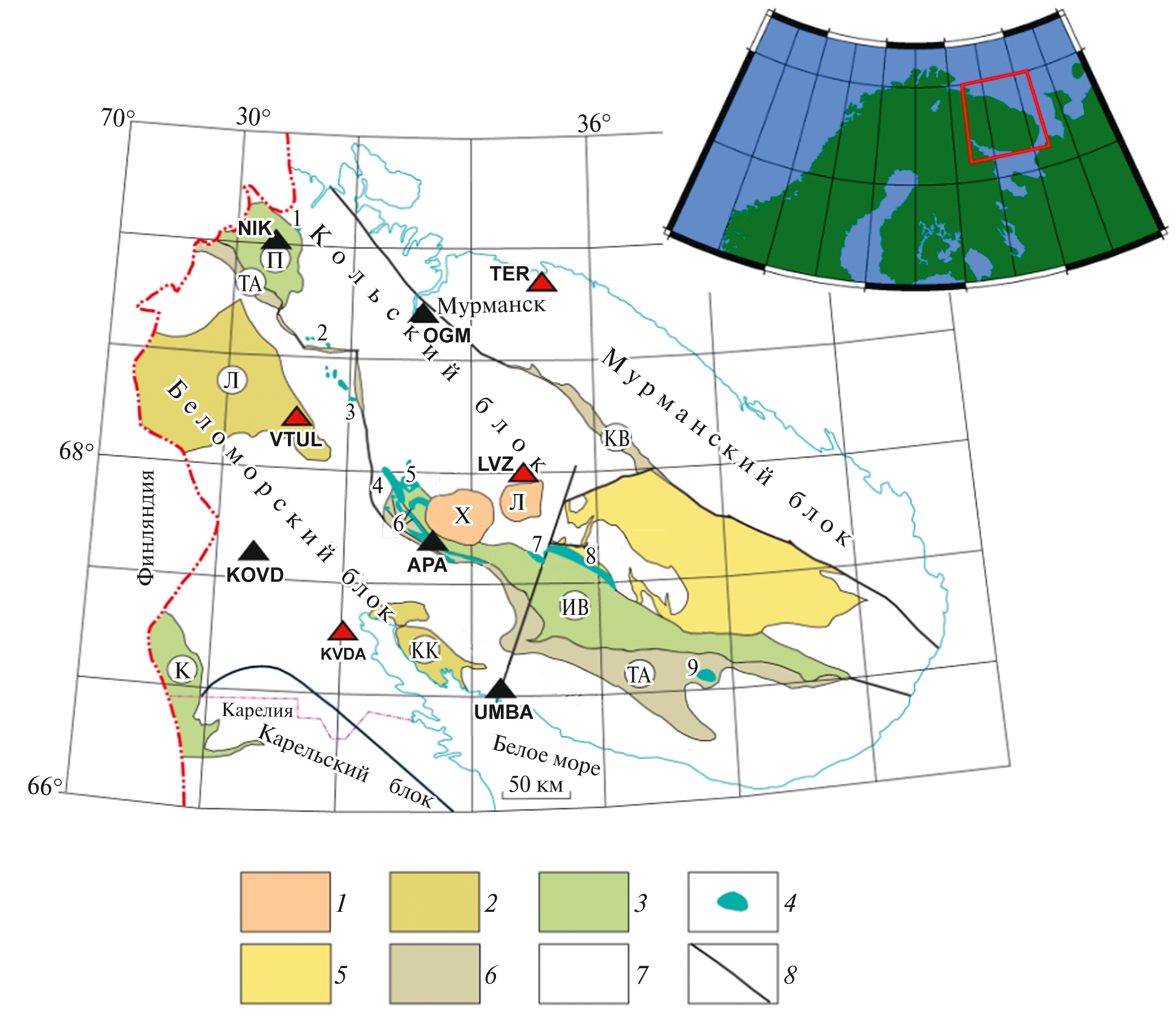 Рис. 1. Основные тектонические элементы Кольского полуострова по работе [Daly et al., 2006]. 1 – палеозойские плутоны нефелиновых щелочных сиенитов и фоидолитов: Хибинский (Х), Ловозерский (Л); 2 – гранулитовые пояса: Лапландский (Л), Кандалакшско-Колвицкий (КК); 3 – палеопротерозойские рифтогенные структуры (Печенгская (П), Имандра-Варзугская (ИВ) и Куолаярвинская (К)); 4 – расслоенные базитультрабазитовые интрузии с возрастом около 2.45–2.52 млрд лет: г. Генеральская (1), Солозеро (2), Улитаозерская (3), Мончетундровская (4), Мончеплутон (5), Имандровский комплекс (6), Федорова тундра (7), Панские тундры (8), Песочная (9); 5 – неоархейская Кейвская структура с щелочными гранитами в ее обрамлении; 6 – неоархейские зеленокаменные пояса: Колмозеро-Воронинский (КВ), Терско-Аллареченский (ТА); 7 – архейские метаморфические и ультраметаморфические образования; 8 – разрывные нарушения. Треугольниками показаны места установки широкополосных сейсмических станций в Кольском регионе. Коды станций соответствуют табл. 1. Красным выделены станции, данные которых использованы в представленной работе. На врезке приведена карта Фенноскандинавского щита, красным прямоугольником показан регион исследования.