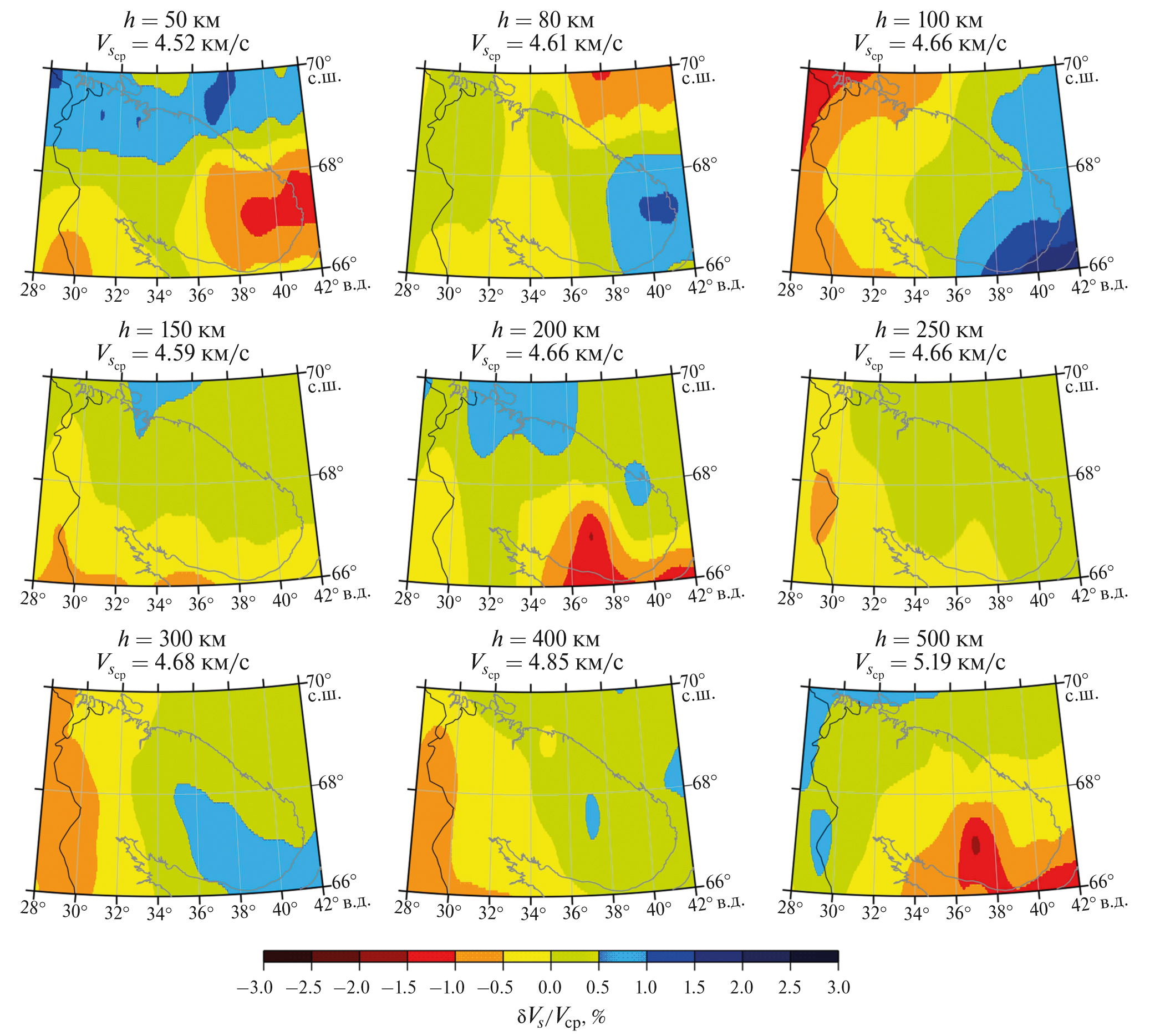 Основные особенности распределения S-волн в мантии под рассматриваемой территорией, полученные по данным поверхностных волн, представлены на рис. 4 и сводятся к следующему. На глубине 50 км минимумы скоростей наблюдаются на востоке Кольского полуострова и под Карельским блоком. Северо-западная часть полуострова и смежные с ней территории Баренцева моря характеризуются повышенными значениями скоростей S-волн. На глубинах 80–100 км характер распределения скоростей S-волн существенно меняется. Так, максимум скоростей на этих глубинах приурочен к востоку Кольского полуострова, причем с увеличением глубины он распространяется на более широкую территорию и становится более выраженным по интенсивности. На глубинах 150–250 км минимальные скорости S-волн наблюдаются под Карельским и Беломорским блоками. Кольский и Мурманский блок по значениям скоростей в этом интервале глубин различаются лишь на глубине 200 км, на которой более высокие скорости приурочены к Мурманскому блоку. Отметим, что в целом для литосферы региона в интервале глубин ∼120–180 км характерно понижение скоростей S-волн. В диапазоне глубин 300–400 км под исследуемым регионом прослеживается увеличение скоростей в восточном направлении. С увеличением глубины до 500 км, напротив, скорости S-волн уменьшаются с запада на восток.