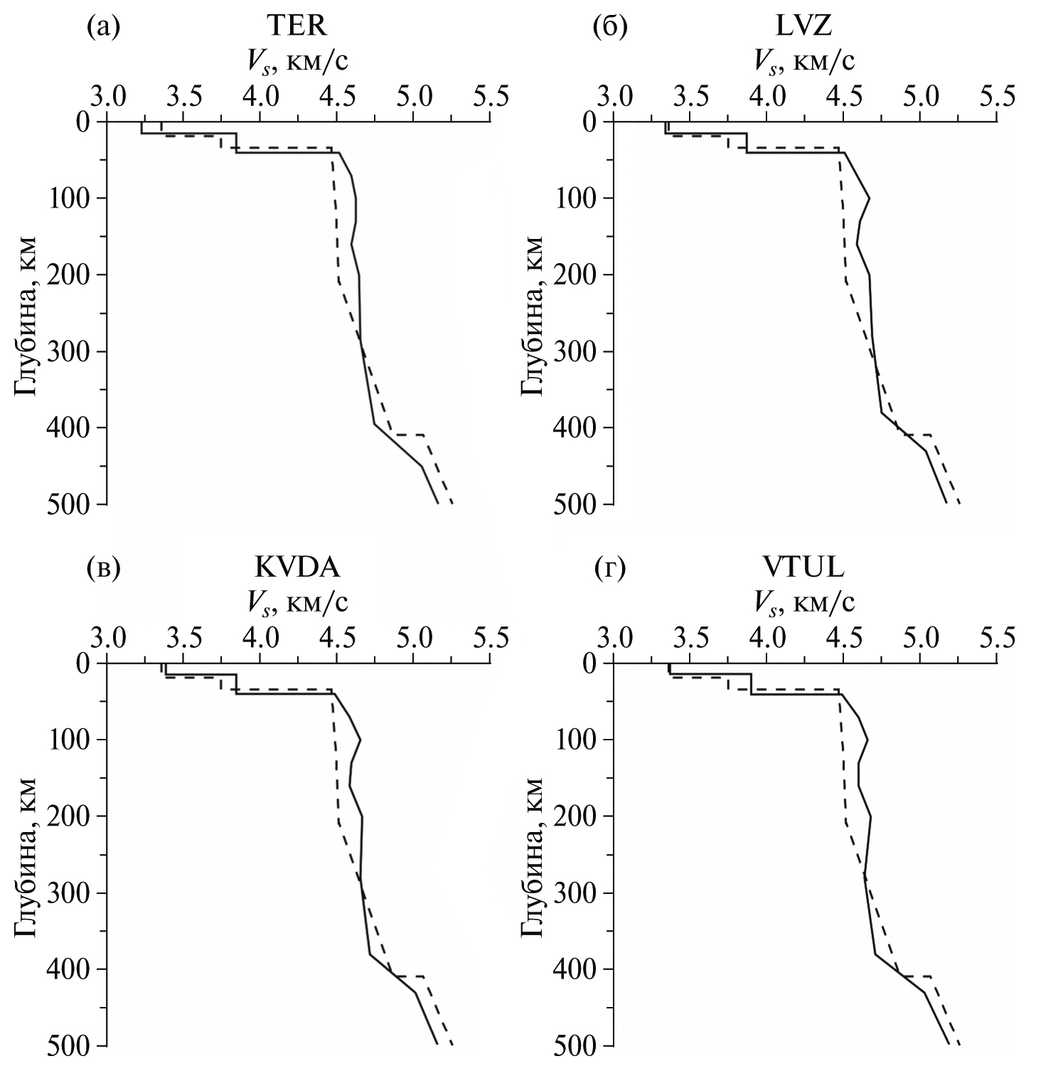 Для удобства сравнения структуры верхней мантии в районе сейсмических станций, для которых был выполнен анализ методом приемных функций (рис. 3), приведем скоростные разрезы S-волн, рассчитанные по локальным дисперсионным кривым групповых скоростей волн Рэлея в ближайших к станциям точках (рис. 5). Из рис. 5 видно, во-первых, что верхняя мантия под всеми станциями характеризуется высокими значениями скоростей S-волн (Vs > 4.5 км/c). Во-вторых, одномерные скоростные разрезы под станциями LVZ, KVDA и VTUL (Кольский и Беломорский блоки) близки между собой по значениям скоростей и характеру изменения скорости с глубиной, в то время как разрез под станцией TER (Мурманский блок) существенно от них отличается. Так, под LVZ, KVDA и VTUL на глубинах примерно от 100 до 200 км прослеживается слой относительно пониженных скоростей (на 0.06–0.08 км/c), а под станцией TER наблюдается лишь слабая тенденция к понижению скоростей (на 0.02–0.03 км/c) на этих глубинах. Принимая во внимание, что погрешности определения дисперсионных кривых групповых скоростей волн Рэлея на периодах 20–200 с составляют 0.02–0.03 км/c [Филиппова, Соловей, 2022], погрешность вычислений скоростного разреза S-волн в мантии до глубины ∼300 км может доходить до 0.04 км/c. Таким образом, под станцией TER слой пониженных скоростей в литосфере не выделяется, в отличие от станций LVZ, KVDA и VTUL.