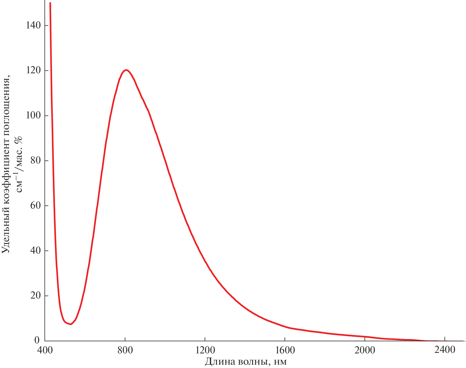 Optical transmission of Cu2+-doped multicomponent glasses in the TeO2−ZnO–Bi2O3 system has been studied by UV spectroscopy. The glasses have been shown to have a strong absorption band in the wavelength range from 350 to 2700 nm, peaking at ~810 nm. For a series of glasses with a given Cu2+ concentration, we evaluated their specific absorption coefficient in this wavelength range—5200 ± 220 dB/(km ppm) at the peak position—and obtained its spectral dependence.