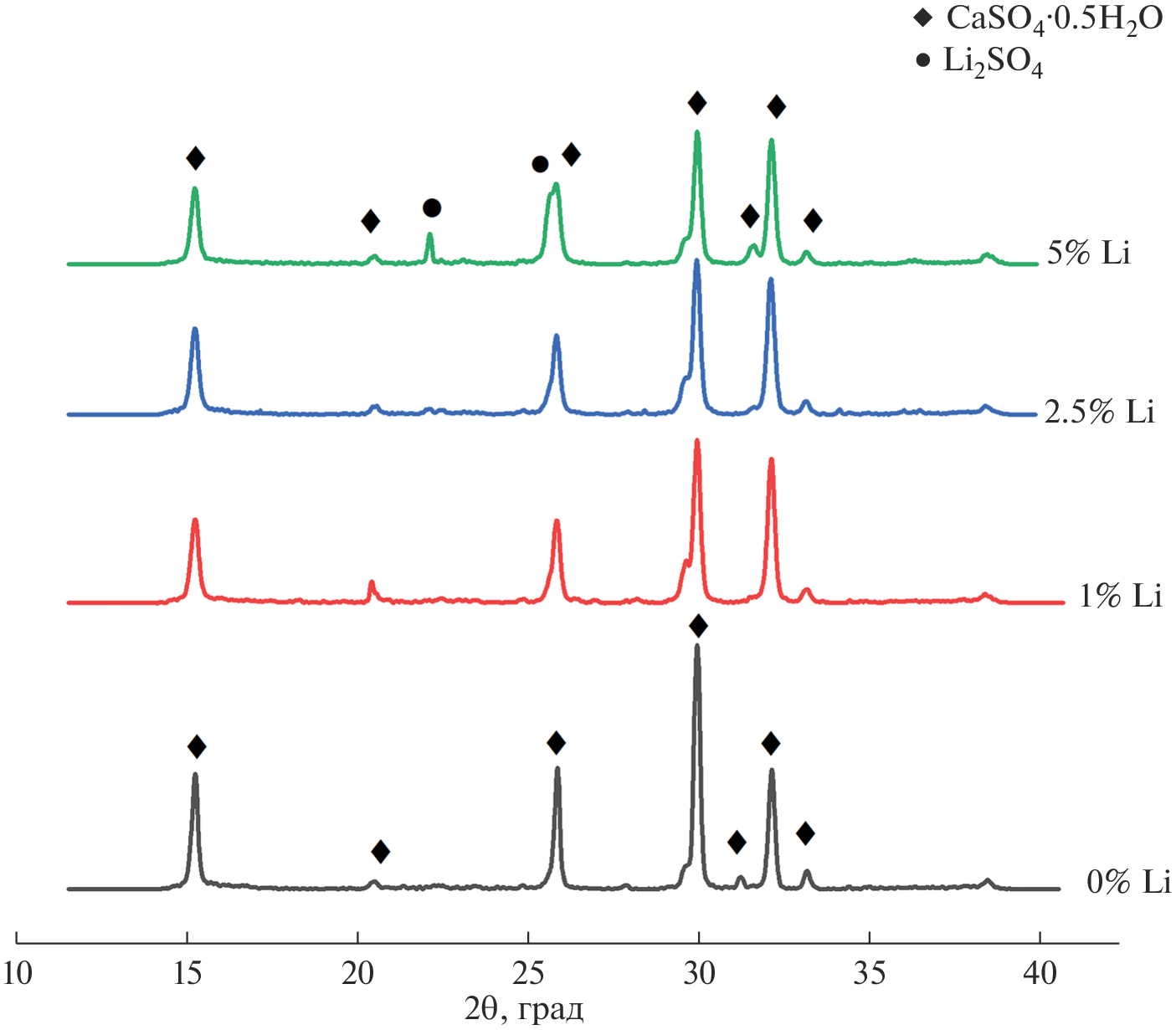 We have studied calcium sulfate (CS) based cement materials containing up to 5 mol % lithium cations. The presence of lithium ions has been shown to increase the solubility of the CS cements in Dulbecco’s solution, which is accompanied by an increase in the pH of extracts from 6.0 to 8.7. Lithium cations were detected in Dulbecco’s phosphate buffered saline during the first 24 h of the experiment, and a calcium phosphate layer was formed on the surface of the lithium-containing CS cements during the seventh day. The presence of lithium ions has been shown to cause a twofold decrease in the temperature of the transition from calcium sulfate dihydrate to the hemihydrate.