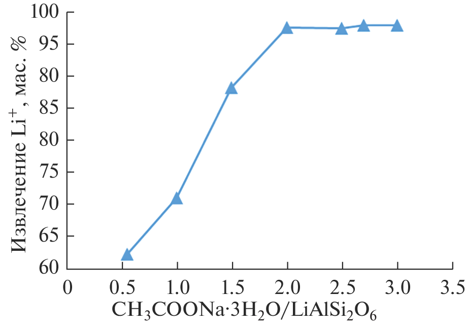 Исследование проведено с целью разработки технологии извлечения лития из сподуменового сырья. В работе показано, что одним из перспективных направлений переработки сподумена является его спекание с ацетатом натрия. Показано, что в результате реакции между компонентами кристаллическая структура сподумена не разрушается. За счет реакции ионного обмена между CH3СOONa⋅3Н2О и LiAlSi2O6 образуется водорастворимый ацетат лития и не растворимый в воде алюмосиликат натрия (NaAlSi2O6). Растворенный в воде ацетат лития переводится в карбонат лития добавлением раствора Na2CO3. Осажденный карбонат лития практически не содержит посторонних примесей. Изучено влияние параметров процесса на степень извлечения Li+ из сподумена.